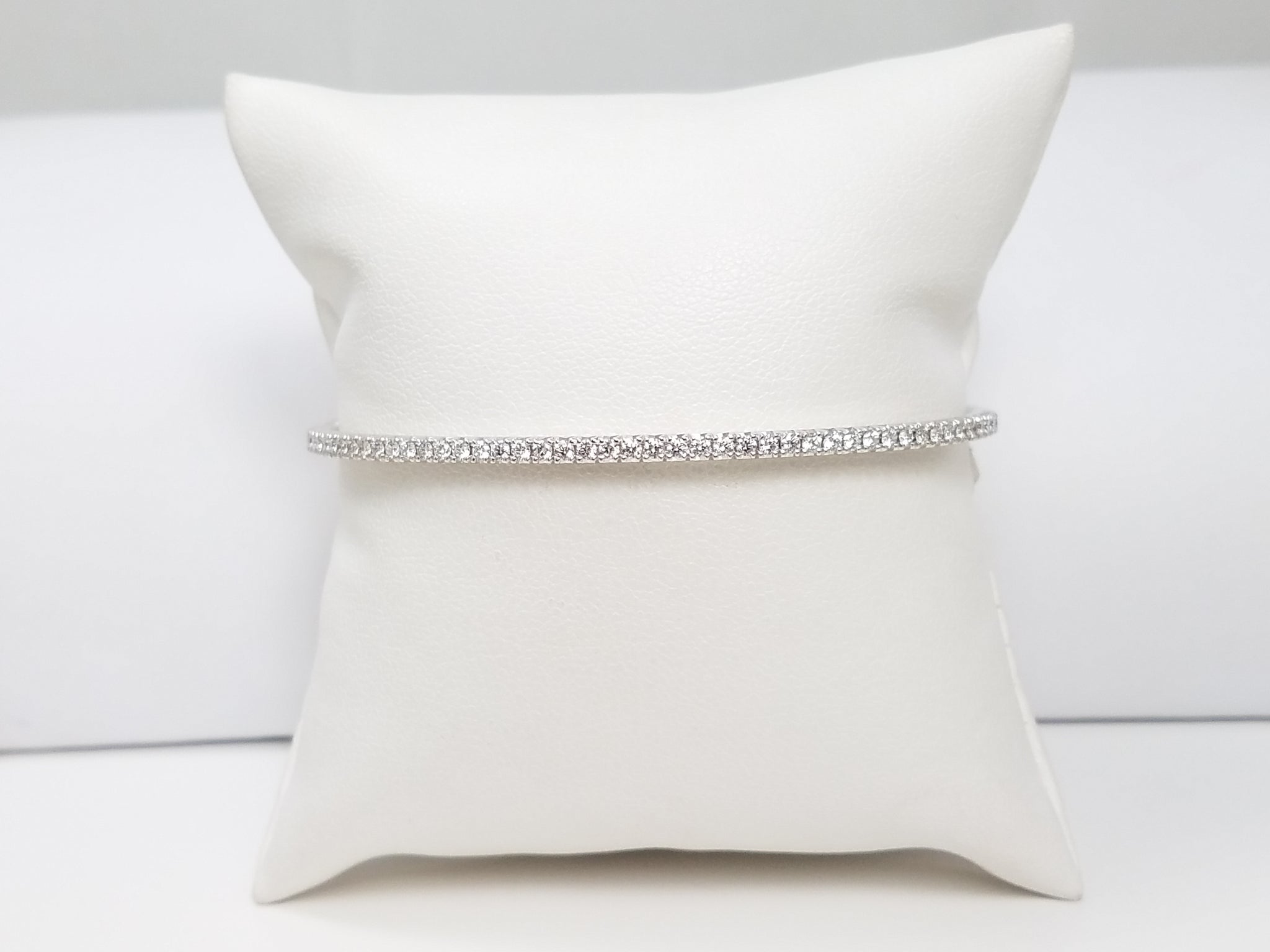 This exquisite Tiffany & Co. natural bangle bracelet was crafted from 18k white gold (stamped "AU750"). It retails for $10,000. Referred to as the Metro bangle bracelet. It features natural round diamonds weighing approximately .73ctw. The diamonds are VS in clarity and G-H in color. It measures 2.2mm wide and 7 1/8" inner circumference. It is secured with a slide locking clasp for wear. It weighs 15.0 grams.