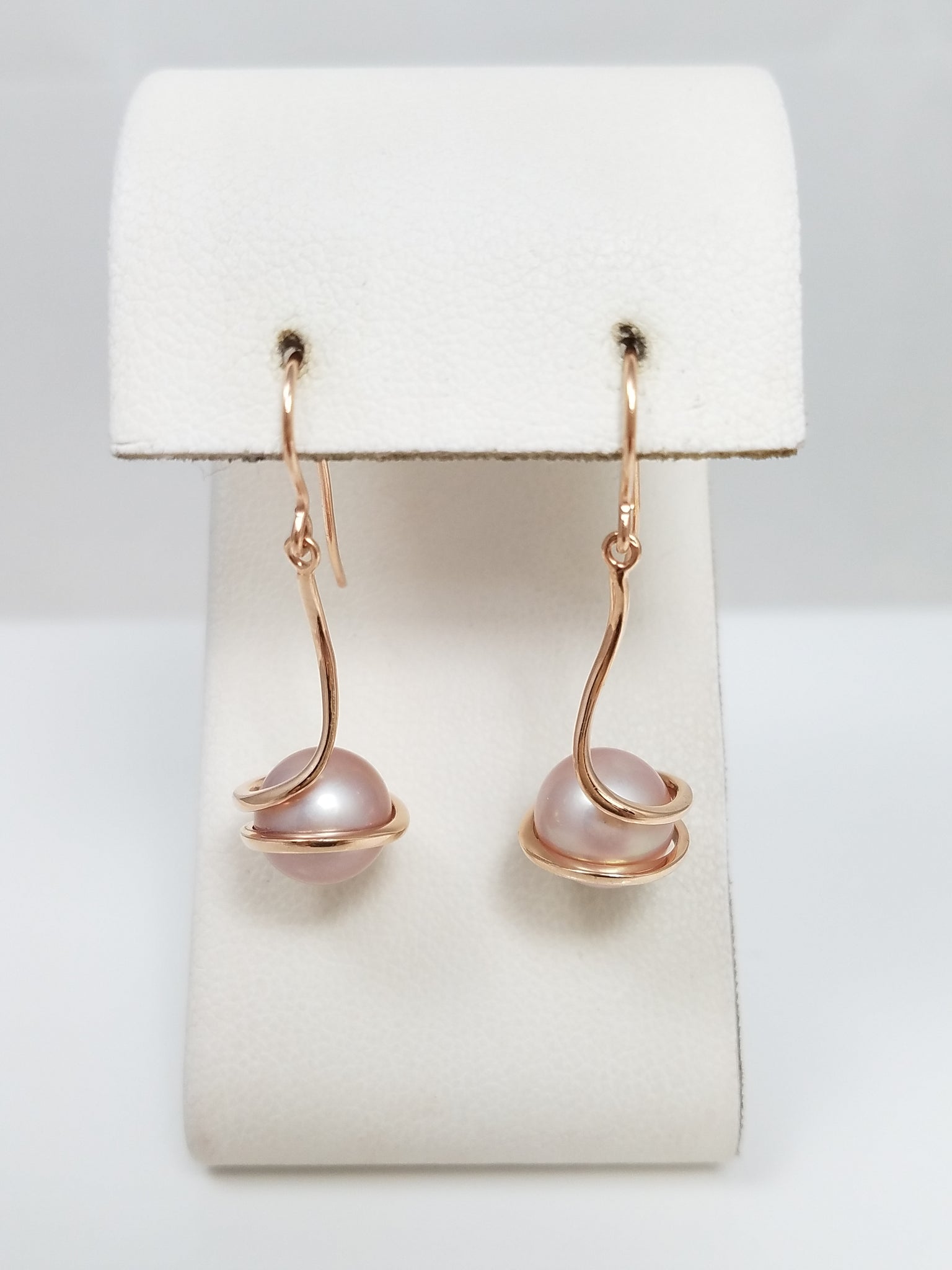 A fun dangle earring set featuring a 8.5mm cultured pearl, dangling in a twist of 14k (stamped) rose gold. Earrings measures 1.25" tall. Weigh 3.6 grams.