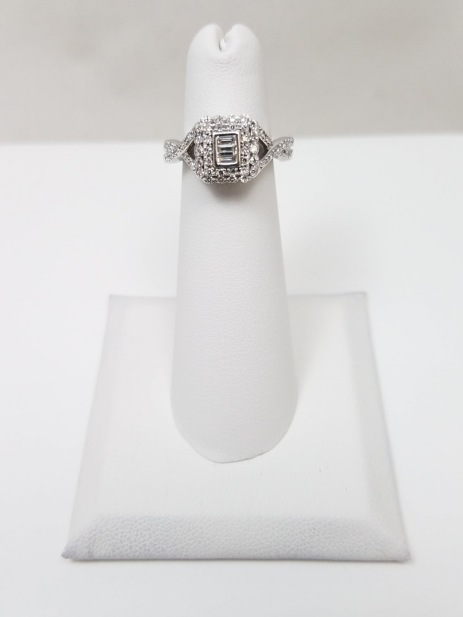 A glowing ring, crafted in 14k (stamped) white gold, decorated with ~.50ctw of natural diamonds. Diamonds are SI/VS clarity and G/H color. Ring is size ~4.5 (has sizing beads). Weighs 3.6 grams.