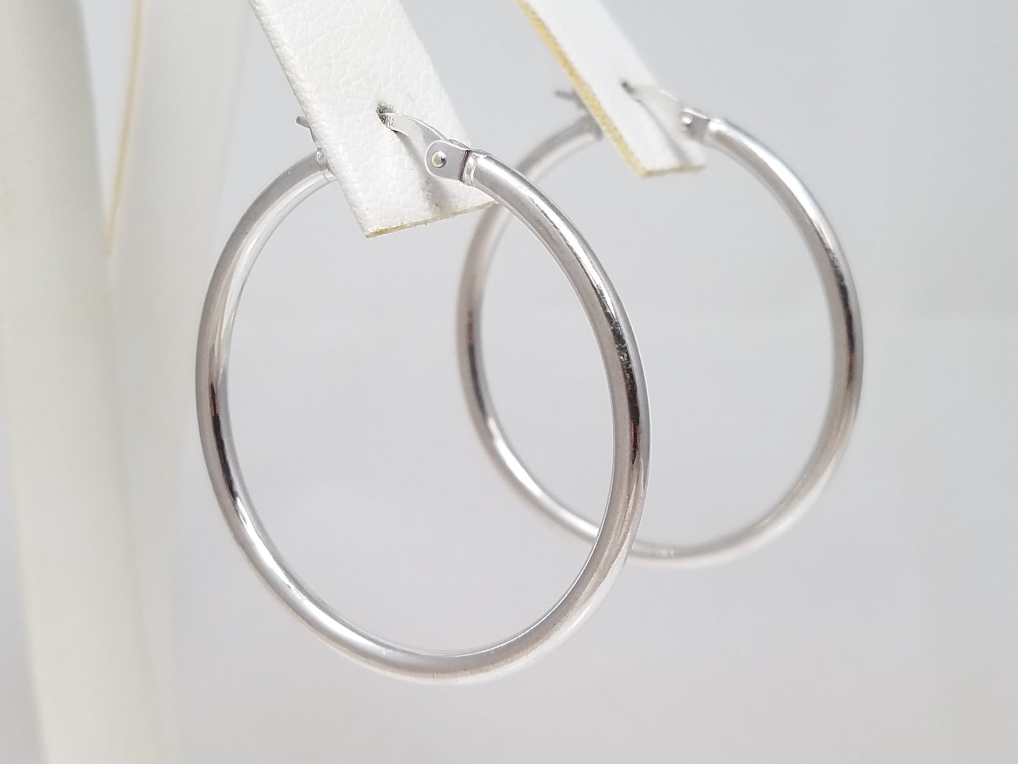 A classic simple hoop set, crafted in 14k (stamped) white gold. Hoops measures 2.1mm wide and are 35mm in diameter. Weigh 3.4 grams. Need polish.