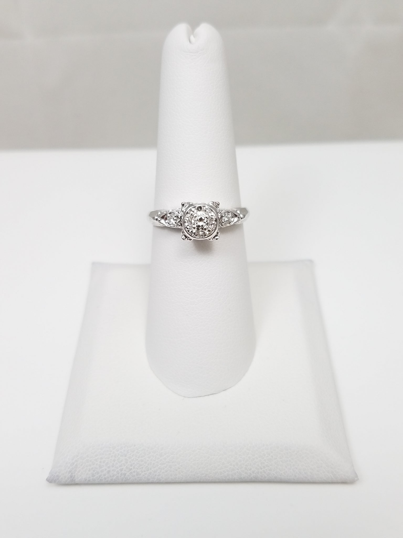 A vintage engagement ring, crafted in 14k (stamped) white gold, set with ~20ctw of natural diamonds. Diamonds are SI clarity and I-J color. Ring is size 7. Weighs 3.0 grams.