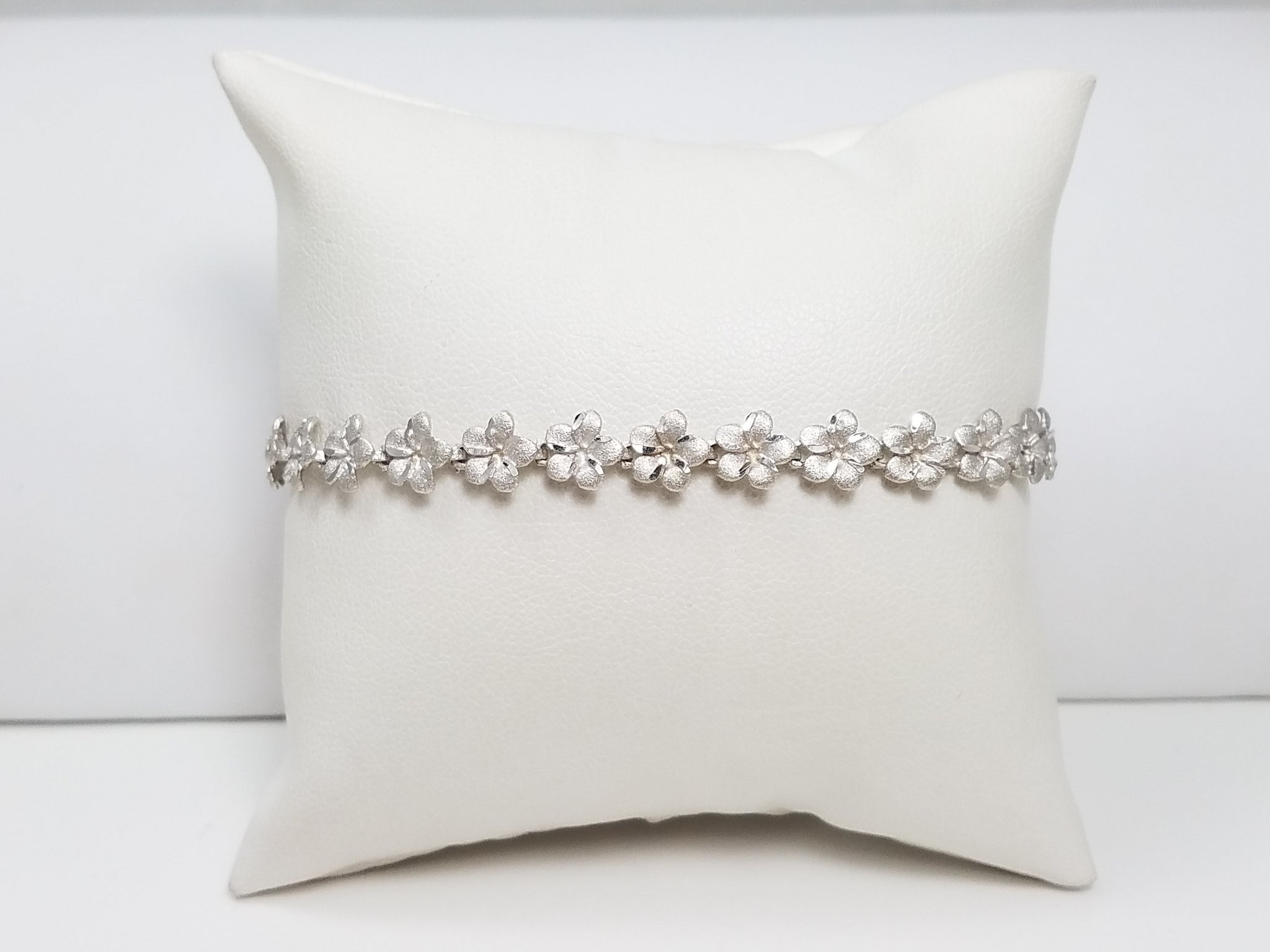 A sweet bracelet is crafted in 14k (stamped) white gold and features plumeria flower blooms. Flowers feature a brushed finish and bracelet measures 7mm wide and 7.5" longs. Secures with lobster clasp for wear. Weighs 8.2 grams.