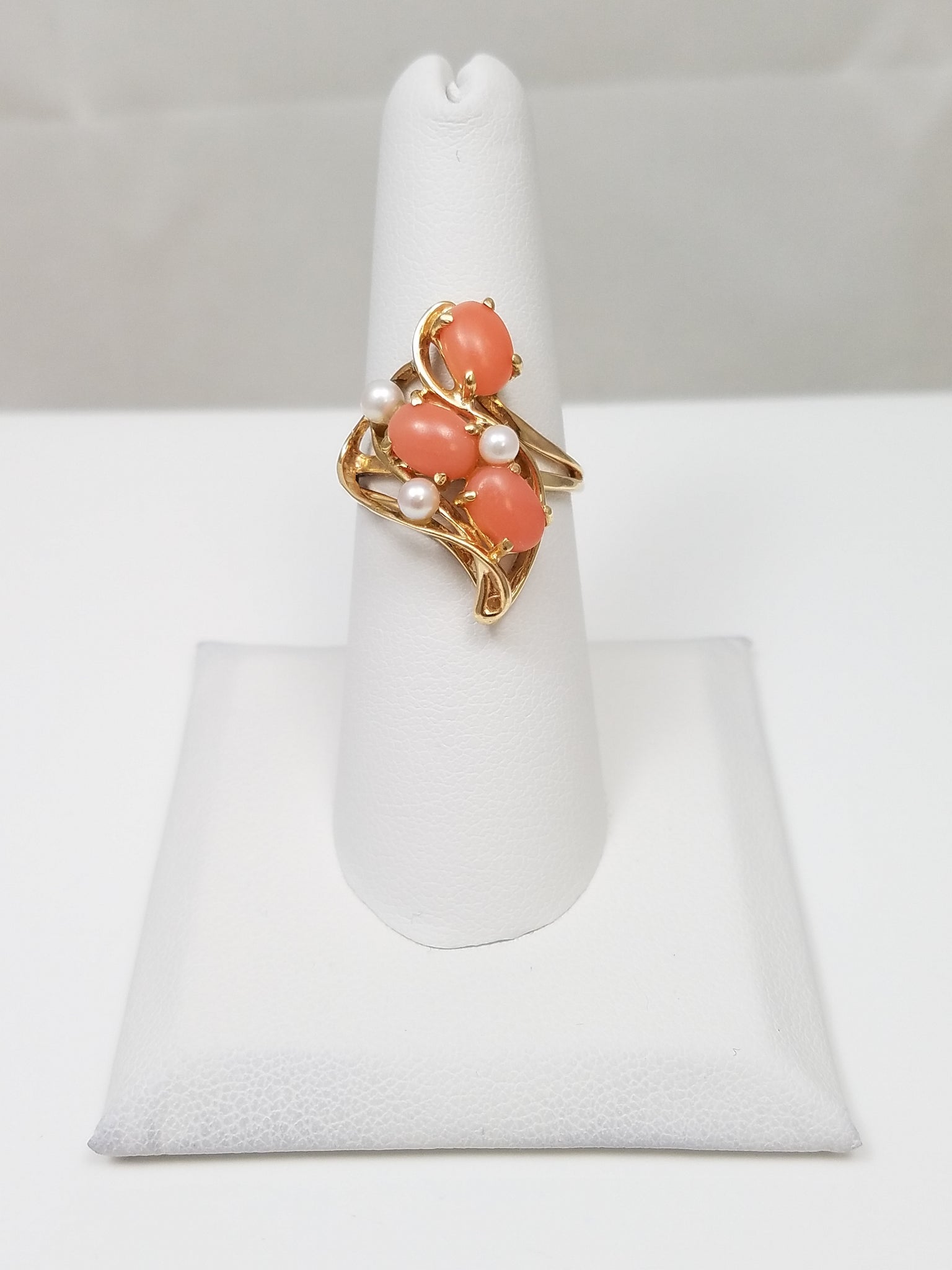 In a unique freeform design, ring cluster sets natural coral and cultured pearls in 14k (stamped) yellow gold. Ring measures 24mm wide on top of finger and is a size 6. Weighs 5.0 grams.
