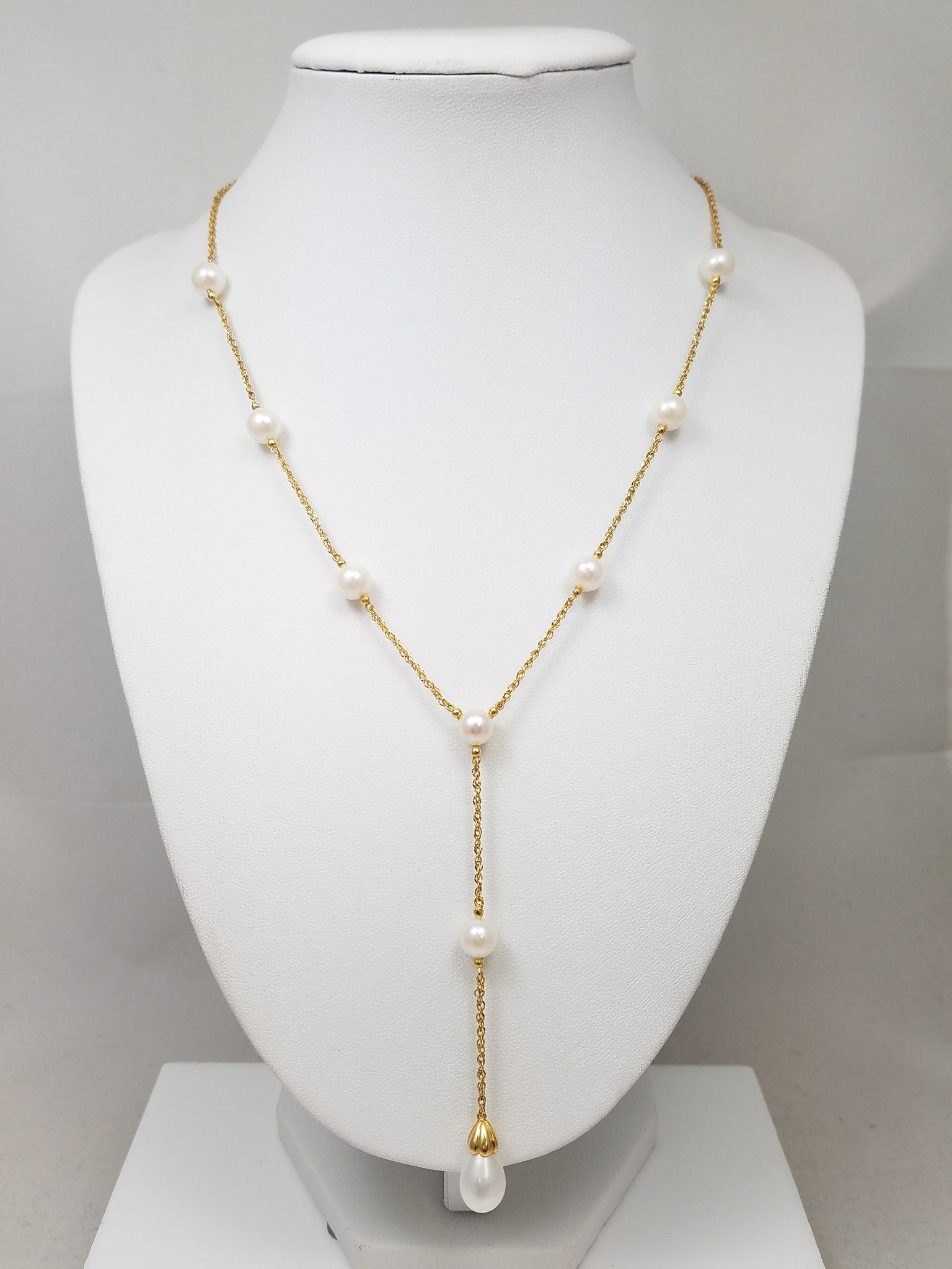 14k Yellow Gold Dangling Cultured Pearl Station Necklace
