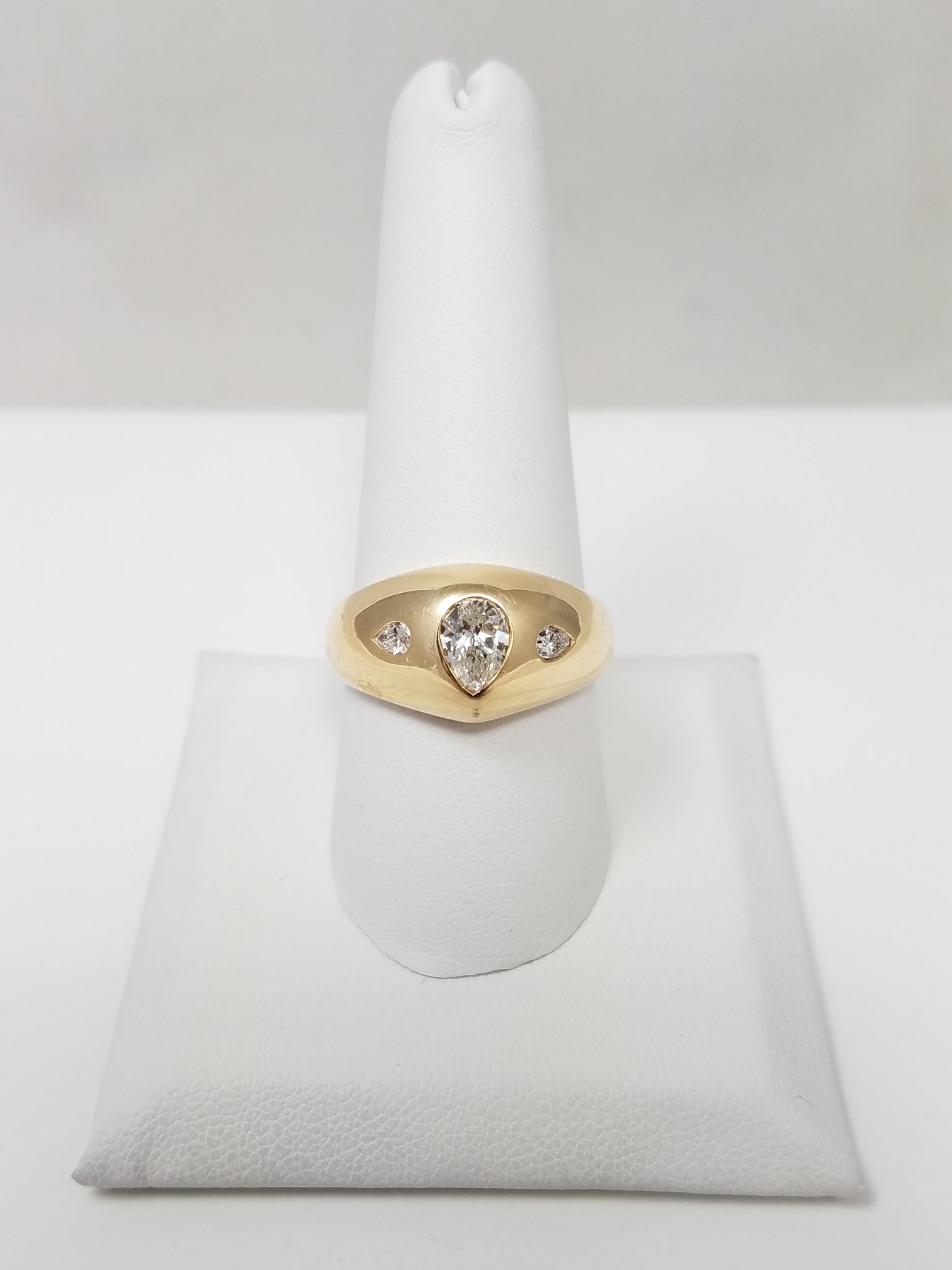 A beautifully dome shape designed ring, crafted in 14k (stamped) yellow gold, centering a ~.60ct pear shaped natural diamond (SI2 clarity, I/J color), accented on each side by a smaller pear shaped natural diamond. Accenting diamonds total ~.14ctw (SI clarity, I/J color). Ring measures 12mm wide on top and is a size 9.75. Weighs 8.4 grams.