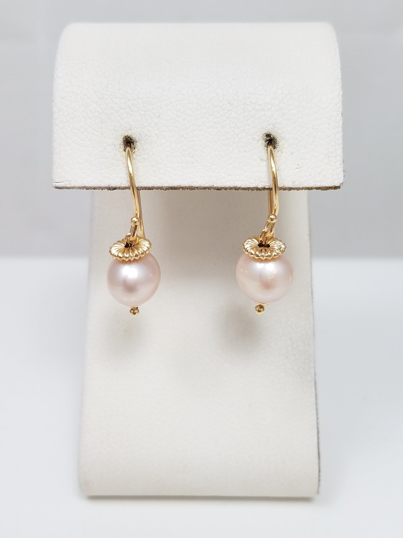 A beautiful earring set, crafted in 14k (stamped) yellow gold, dangling with freshwater cultured pearls with a blush pink hue. Earrings dangle ~8mm long. Weigh 2.0 grams.
