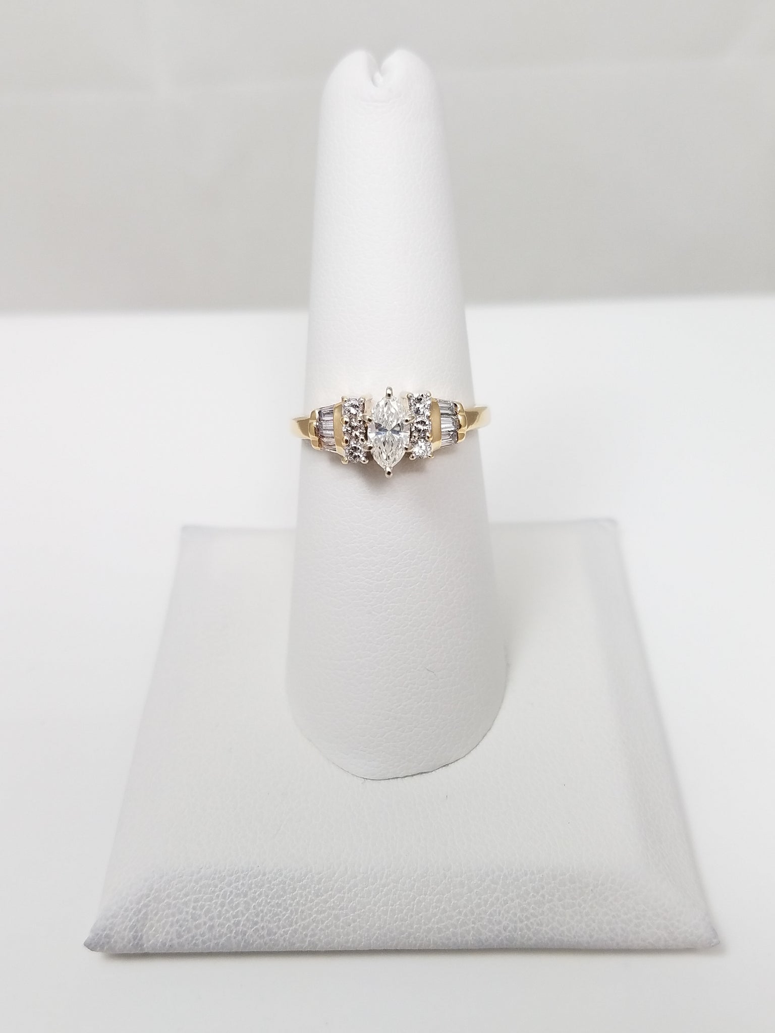 This elegant 14K (stamped) yellow gold engagement ring features a beautiful marquise-cut natural diamond at its center, beautifully complemented by shimmering baguette and round natural diamond accents. Diamonds total ~.50ctw and are VS-I1 clarity and H-I color. Ring is size 7. Weighs 4.0 grams.