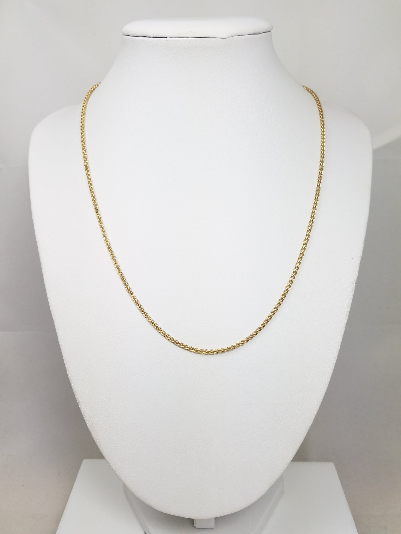 A classically refined look, perfect for every outfit! This solid round wheat link chain is finely crafted with 14k (stamped) yellow gold and measures 2mm in width and is 18" long. Secures with lobster clasp for wear. Weighs 7.3 grams.