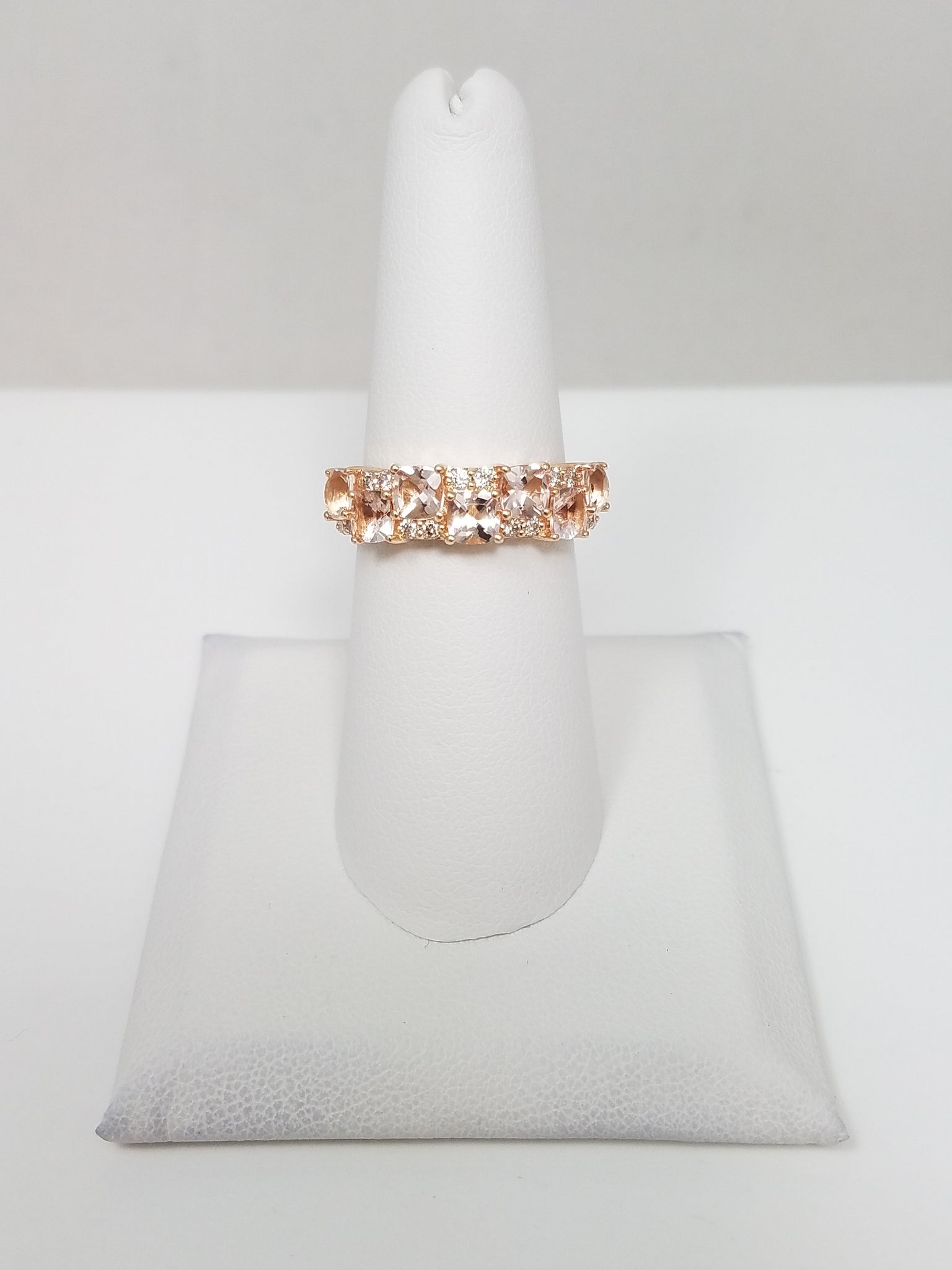 Retail price of ~$3,500!! This gorgeous Le Vian ring band, shimmers across the top with natural morganite gems and natural diamonds, beautifully complemented by 14k (stamped) rose gold. Diamonds total ~.14ctw and are SI/I1 clarity and H color. Ring measures 6mm wide on top and is a size 7. Weighs 5.5 grams.