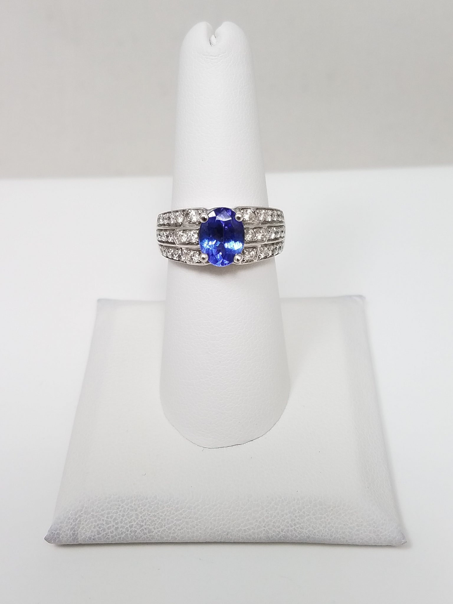 This Le Vian (stamped) natural tanzanite and diamond ring was crafted with 14k white gold (stamped "14k","LeVian"). It retails for $4,000. It features a center natural oval shaped tanzanite weighing ~1.50ct. It is accented with natural round diamonds weighing ~.50ctw. The diamonds are SI1-I1 in clarity and H-I in color. The ring measures 9.0mm lengthwise on top of finger. Ring size is 7. It weighs 6.4 grams.