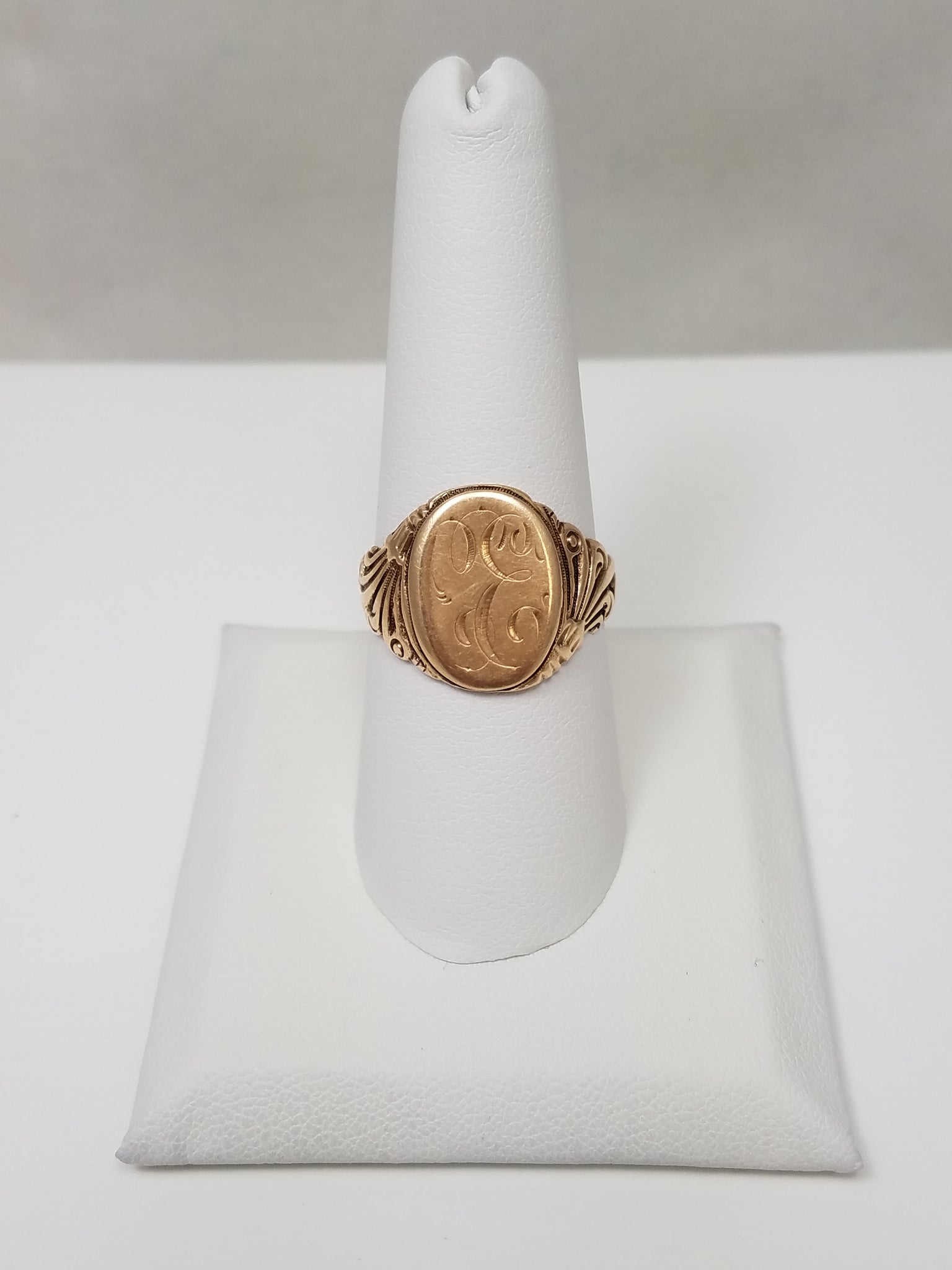 A classic Art Nouveau signet ring, designed in 8k (XRF) yellow gold. Ring measures ~15mm wide on top and is a size 8.5. Weighs 5.0 grams.