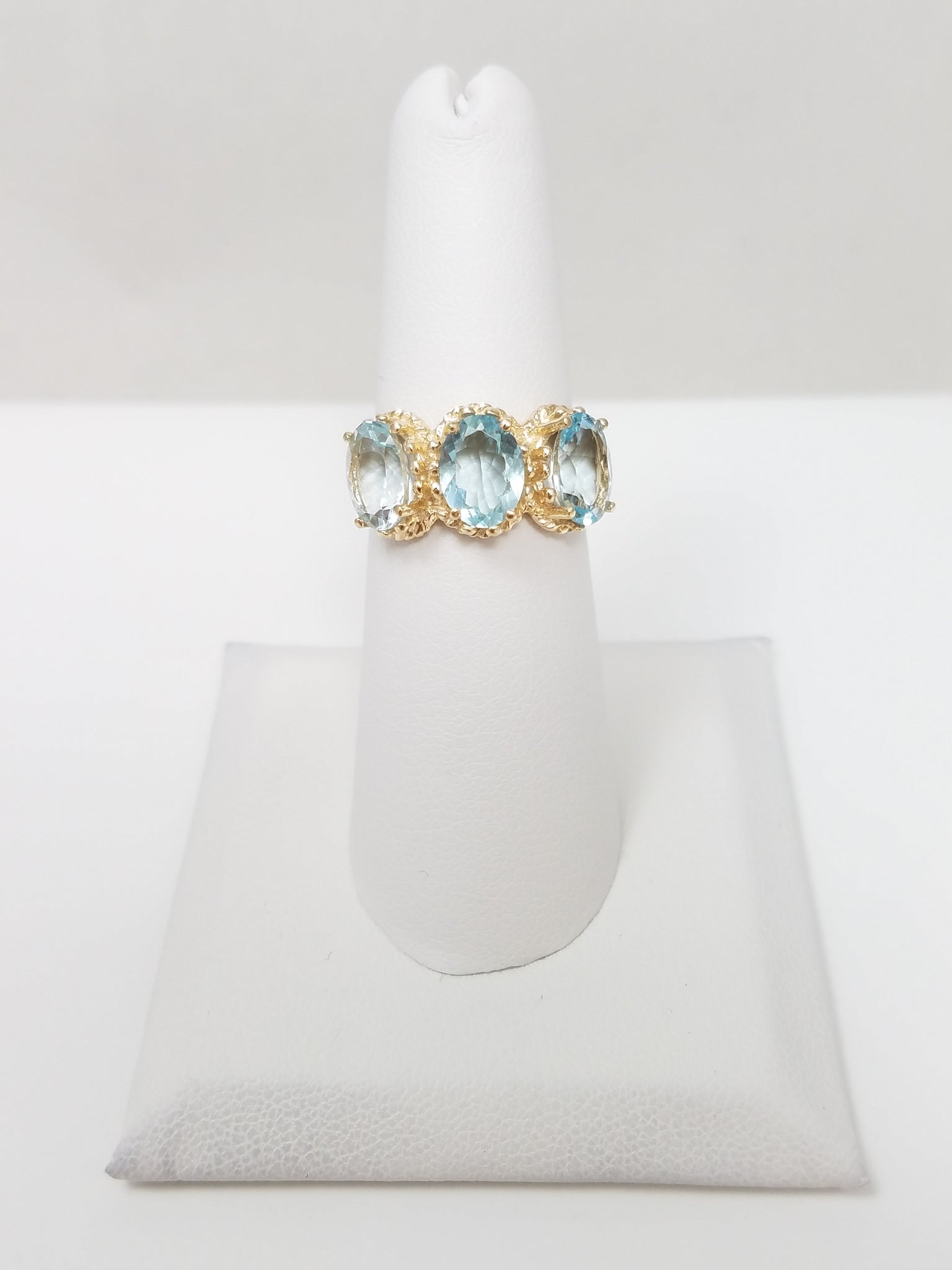 This amazing natural aquamarine ring was crafted from 10k yellow gold (stamped "10k"). It features 3 natural oval shaped aquamarine gemstones weighing approximately 3ctw. The ring measures10mm lengthwise on top of finger. Ring size is 6. It weighs 4.1 grams.