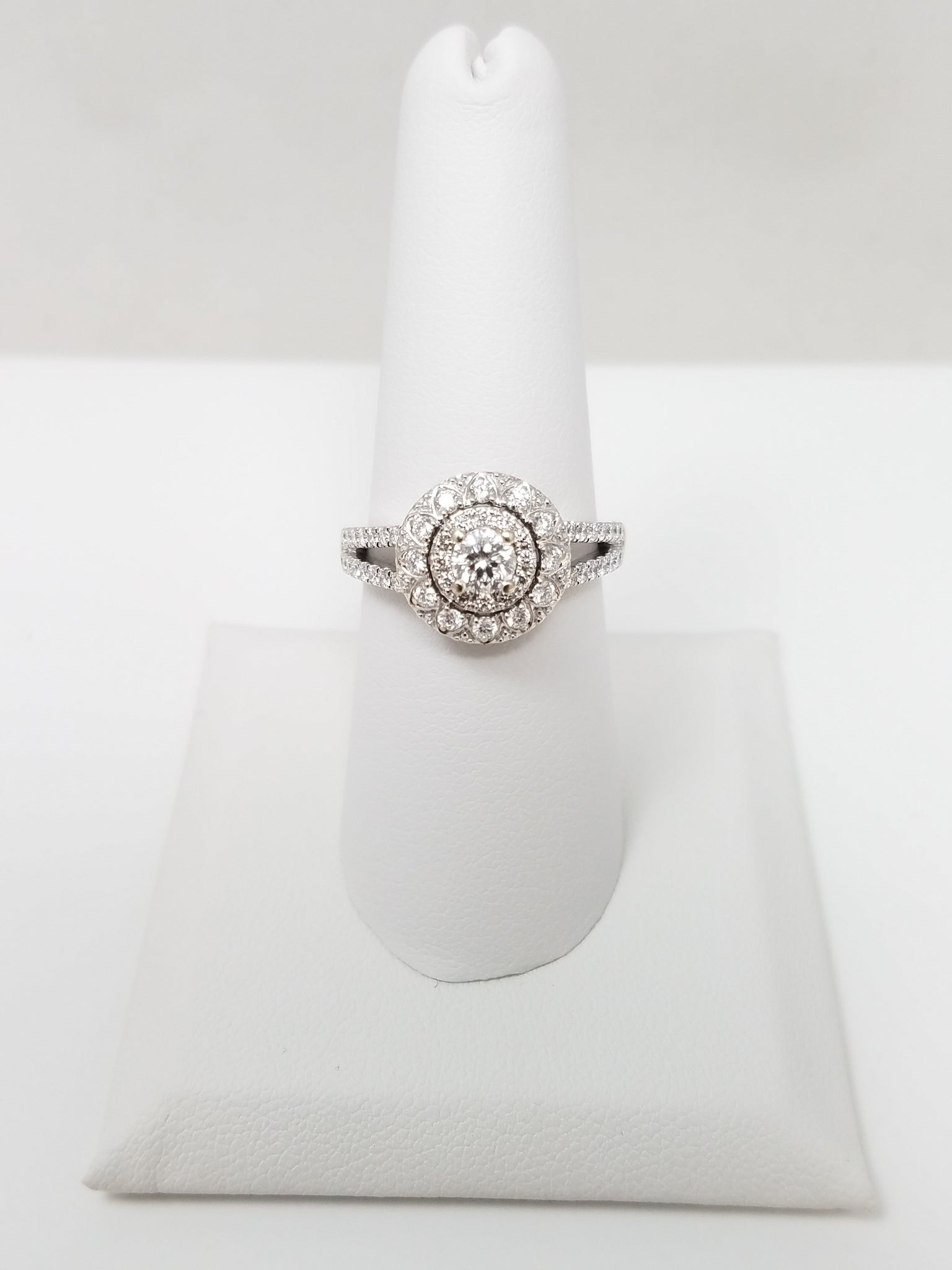 This natural diamond engagement ring is crafted of 14k white gold (stamped "14k"). Features ~1ctw of natural round diamonds. These are SI-VS in clarity and G-H in color. Ring size is 7.5. Weighs 5.5 grams. Halo measures ~12mm.
