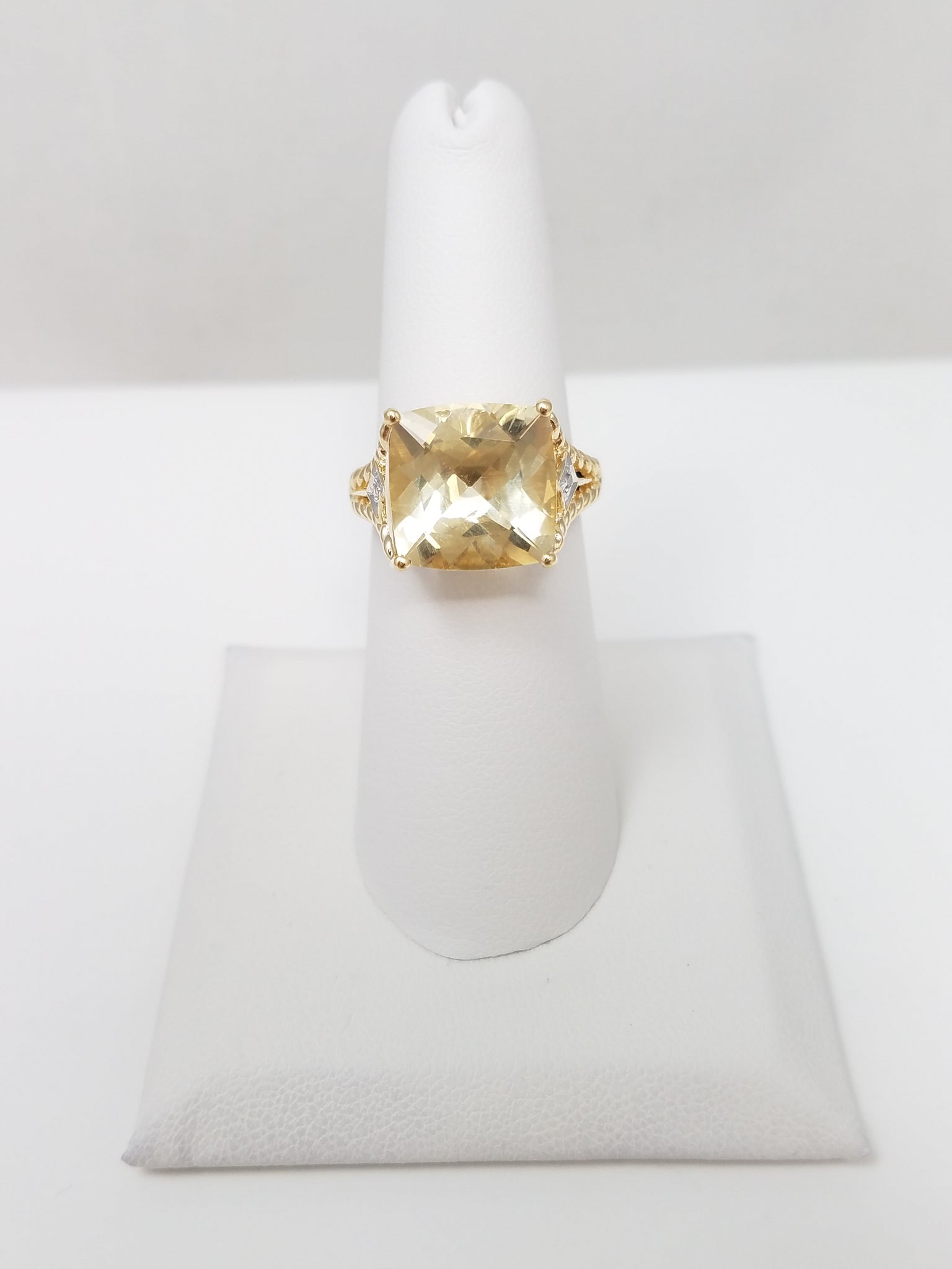 This decorative natural citrine and diamond ring was crafted from 14k yellow gold (stamped "14k"). It features a center natural square cut citrine measuring approximately 12 x 12mm. It is accented with natural round diamonds weighing approximately .01ctw. The diamonds are I3 in clarity and K-L in color. Ring size is 6. It weighs 4.9 grams.