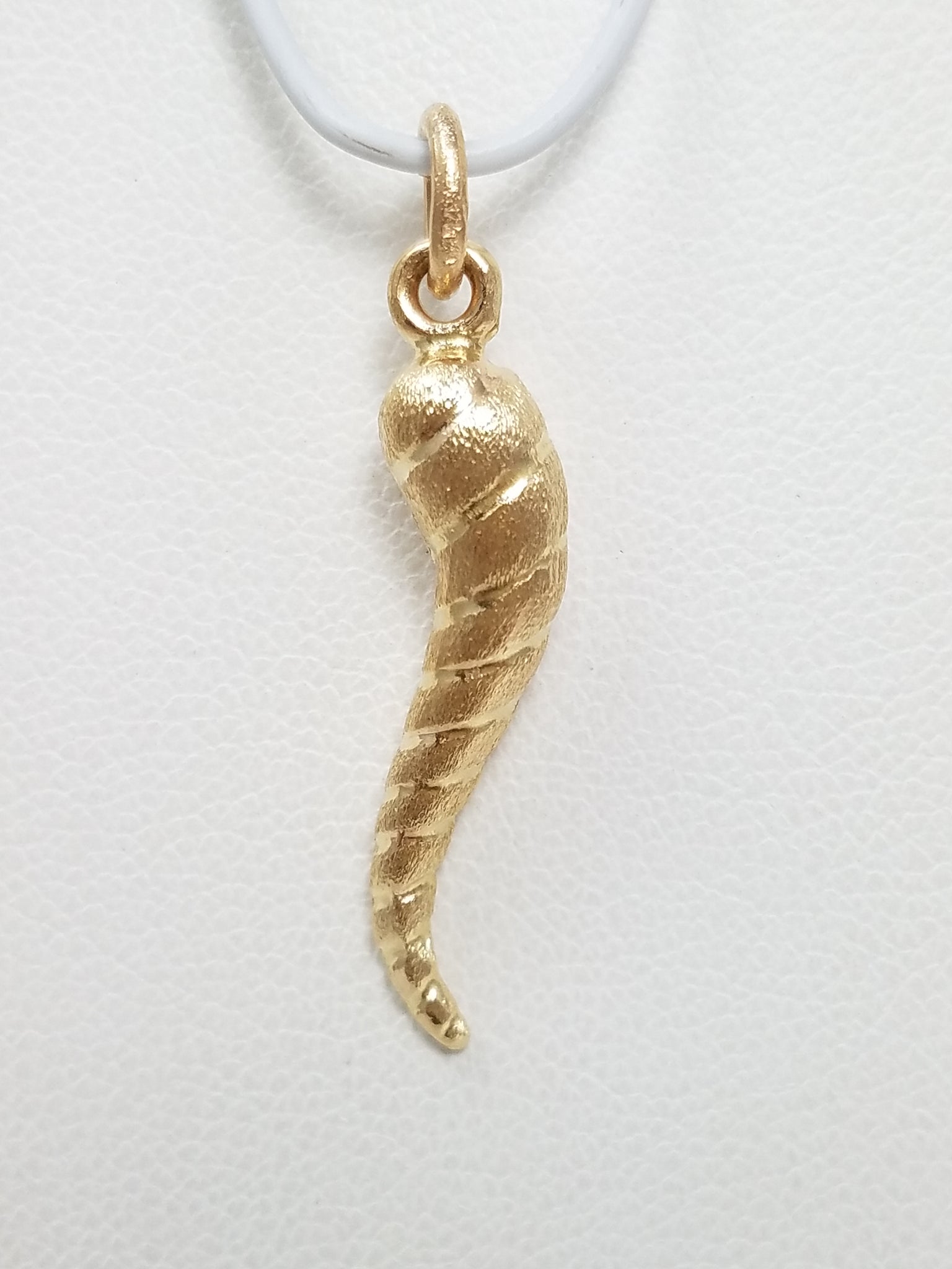 This classic Italian horn is crafted of 14k (marked) yellow gold and has a brushed finish to it. The charm is 3D and measures 1.25" tall. The weight is 1.5 grams. A nice jump ring is already attached, ready for wear.