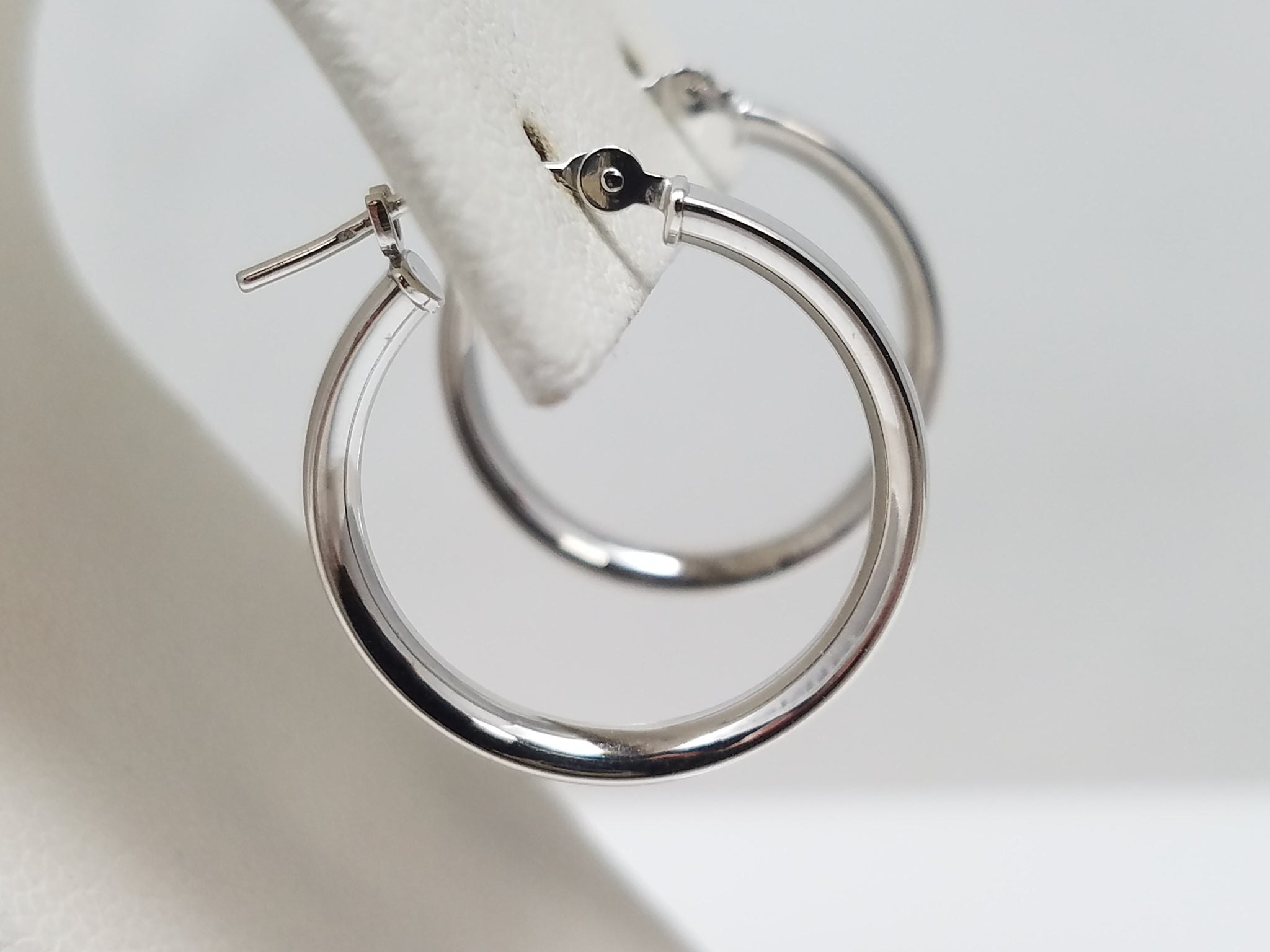 These everyday hollow hoop earrings were crafted from 14k white gold (stamped "14k"). They measure 3mm wide and 3/4" in diameter. They are secured with hinged snap closures for wear. They weigh 1.2 grams total.