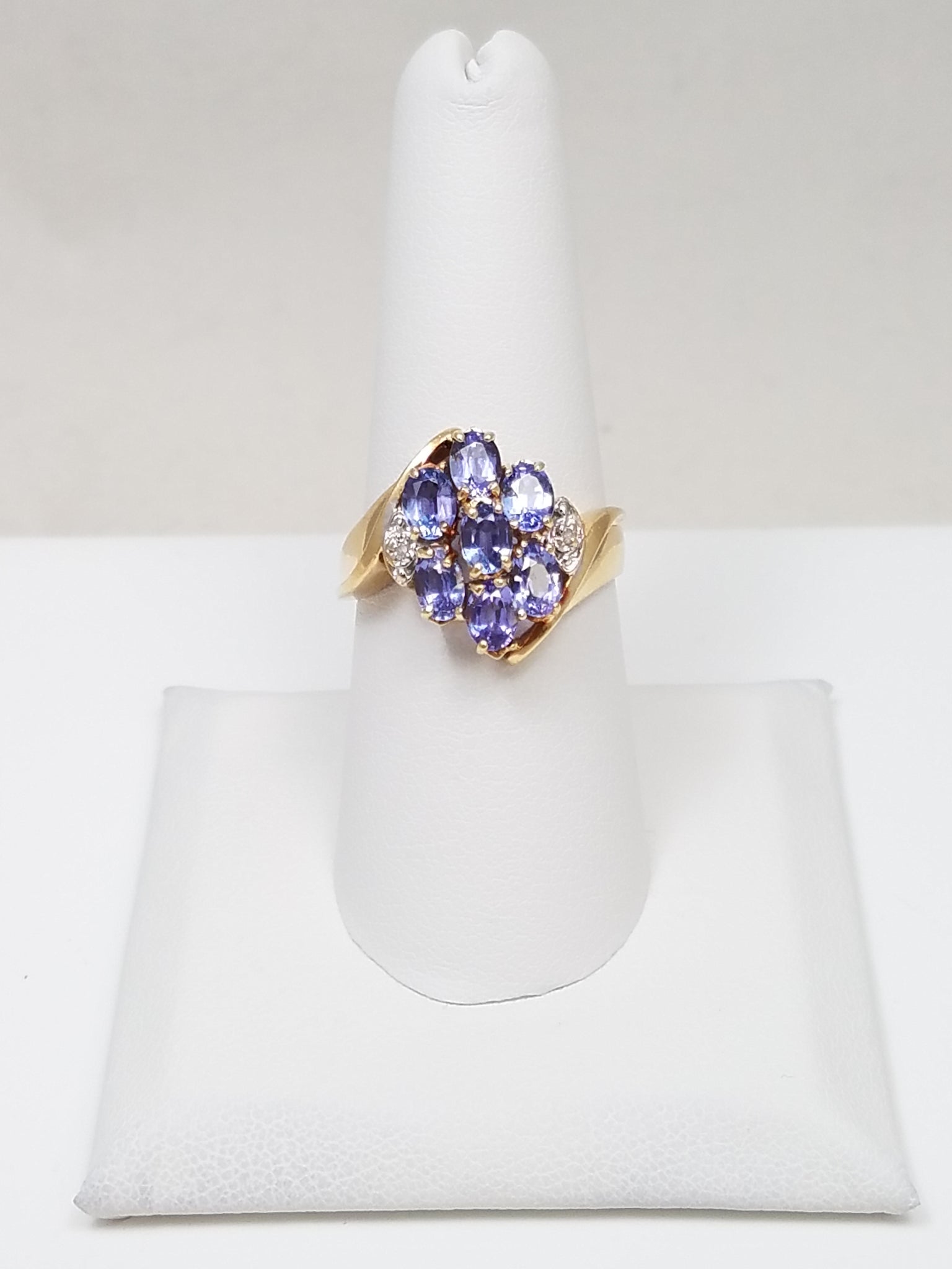 This precious natural tanzanite and diamond ring was crafted from 14k yellow gold (stamped "14k"). It features 7 natural oval shaped tanzanite gemstones. They are accented with 2 natural round diamonds weighing approximately .02ctw. The diamonds are I1 in clarity and I in color. The ring measures 16mm lengthwise on top of finger. Ring size is 7.75. It weighs 4.5 grams.