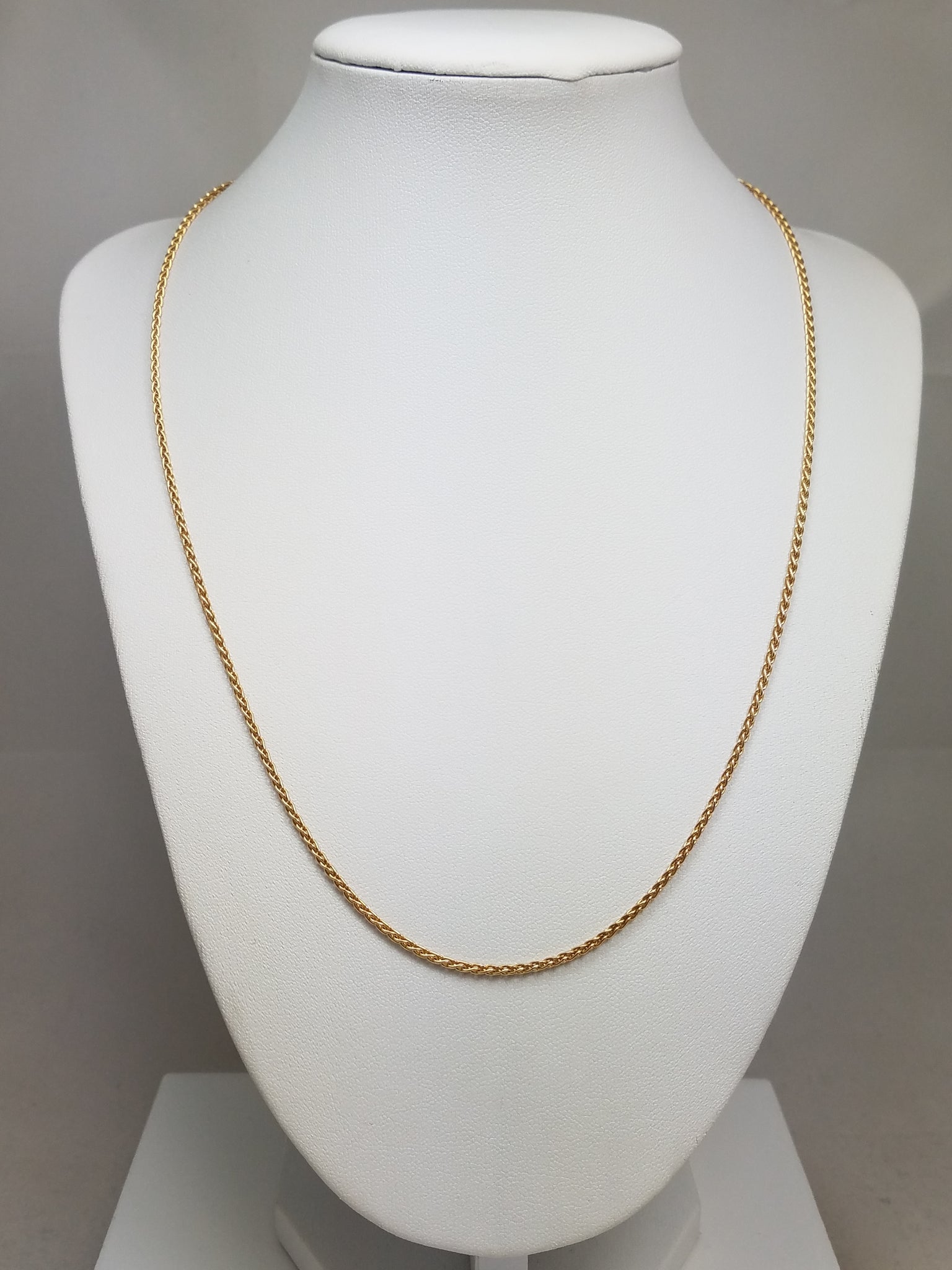 This gleaming rounded wheat chain necklace is crafted from 14k yellow gold (stamped "14k"). Add a pendant or cross to it if you like. Secures with a spring ring clasp for wear. Measures 1.7mm wide and 20" in length. Weighs 6.4 grams.