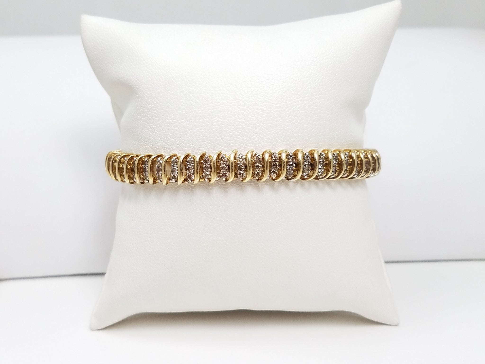 A bold natural diamond tennis bracelet crafted of 10k yellow gold (stamped "10k"). Features natural round diamonds weighing 3.00ctw (stamped). The diamonds are SI1-I2 in clarity and faint brown in color. Secures with a slide locking clasp for wear. Measures 7mm wide and 7" in length. Weighs 14.6 grams.
