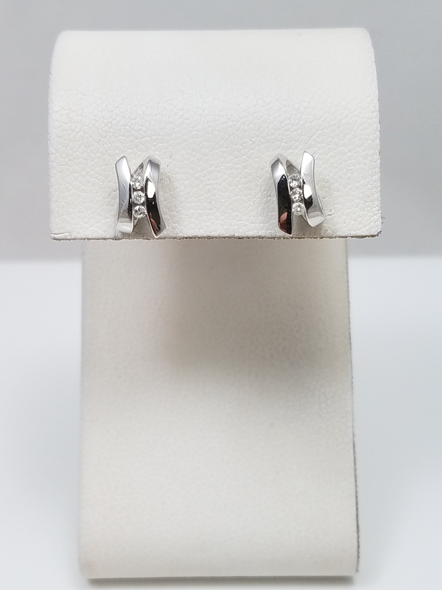 A dainty look, these stud earrings are crafted in 14k (stamped) white gold, accented with 3 natural diamonds each. Diamonds total ~.06ctw and are I1/I2 clarity and I/J color. Secure with butterfly backs for wear. Measure ~9mm tall. Weigh 2.0 grams.