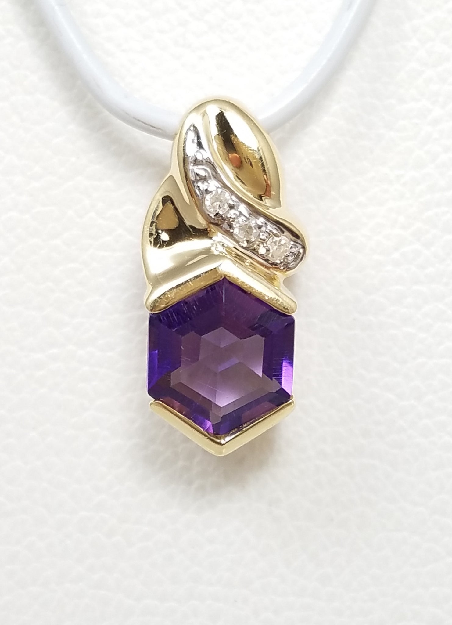 This cute little natural amethyst and diamond pendant was crafted from 14k yellow gold (stamped "14k"). It features an octagon shaped natural amethyst. It is accented with natural round diamonds weighing ~.01ctw. The diamonds are I2 in clarity and I-J in color. The pendant measures 15 x 7mm and is secured with a bail for wear. It weighs 1.2 grams. February Birthstone!