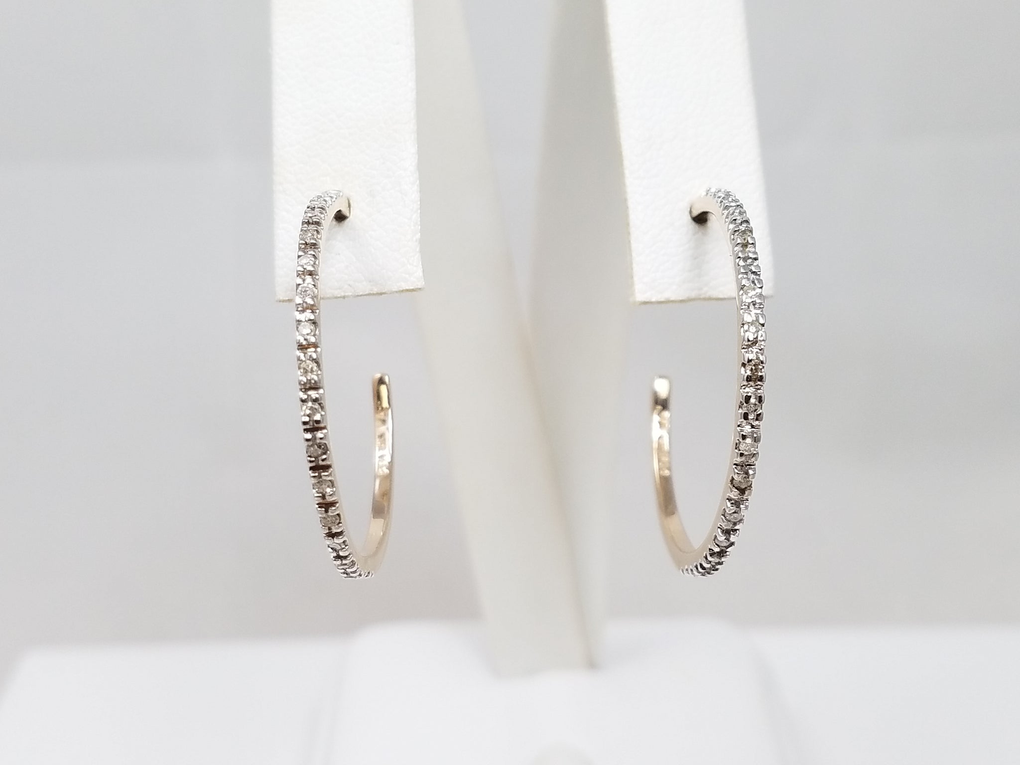 These shimmering natural diamond earrings were crafted from 10k yellow and white gold (stamped "10k"). They feature natural round diamonds weighing ~0.20ctw. The diamonds are I1-I2 in clarity and I-J in color. The measure 28mm in diameter and are secured with butterfly backs for wear. They weigh 3.6 grams total.