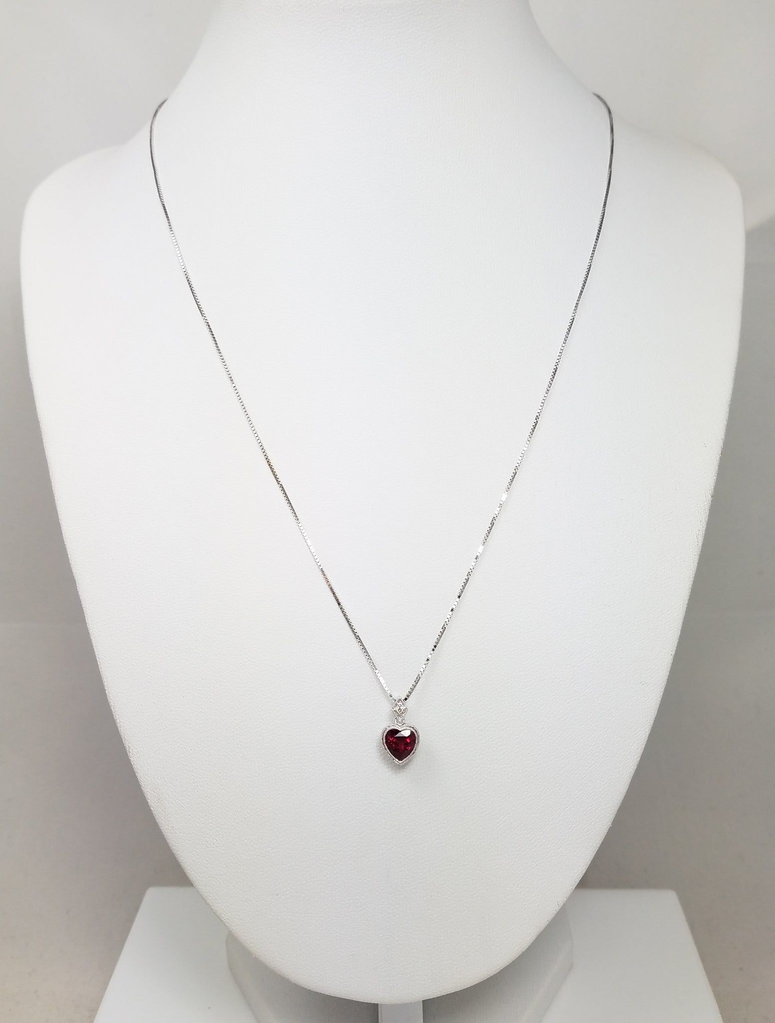 A petite but gorgeous lab created ruby pendant necklace crafted of 14k white gold (stamped "14k"). Features a bright lab created heart shaped ruby weighing approximately .85ct. Accented with one natural round diamond weighing approximately .01ct. Secures with a bail for wear. The chain measures 0.6mm wide and 18" in length and is secured with a lobster clasp for wear. Weighs 2.7 grams total.