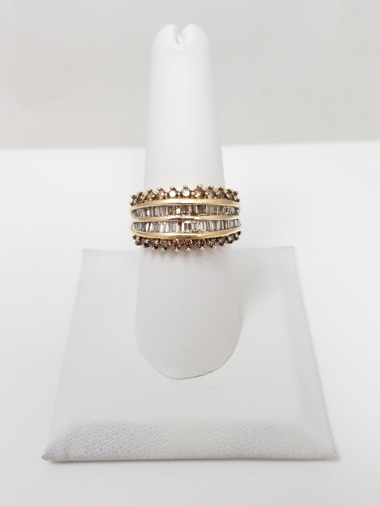 This ring was made from 14k (stamped) yellow gold. Features ~1ctw of natural diamonds. The clarity is SI-I2. The color of the baguettes are J-K, and the color of the rounds are brown. Ring size is 8. Weighs 7.4 grams. Ring measures 12mm in the front.