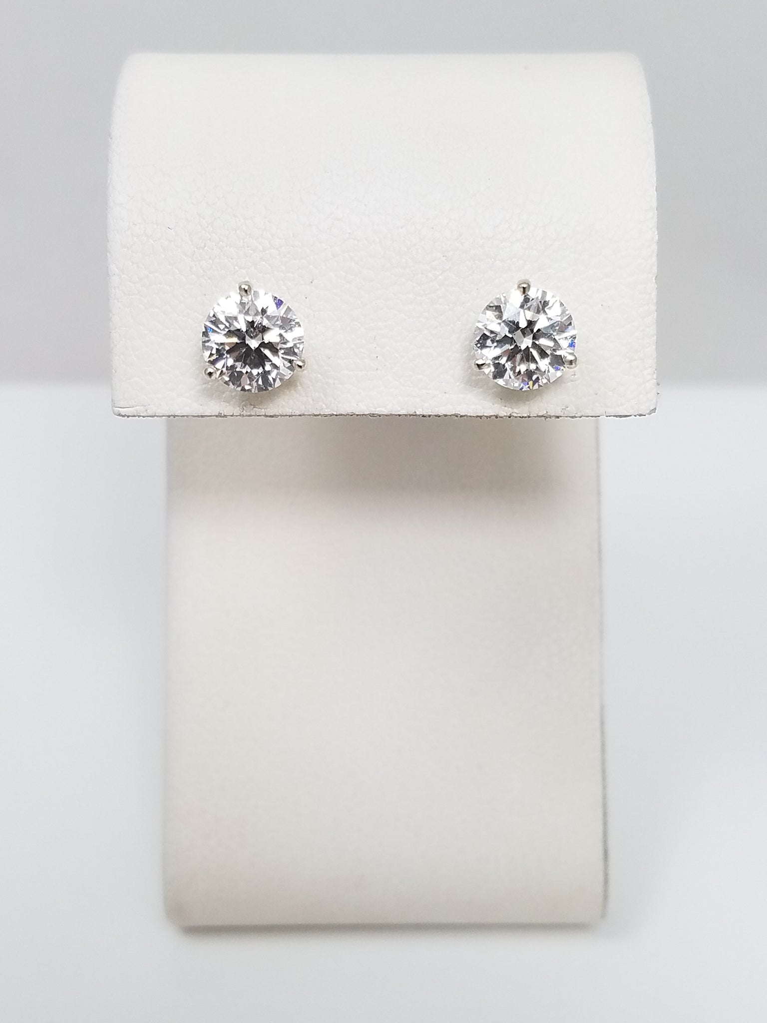 These stunning certified lab grown diamond earrings were crafted with 14k white gold (stamped "14K"). The first diamond measures 6.57 x 6.60 x 4.09mm and weighs 1.10ct. The diamond is VVS1 in clarity and E in color. Certificate #601306596. The second lab diamond measures 6.55 x 6.59 x 4.07mm and weighs 1.09ct. This diamond is VVS1 in clarity and E in color. Certificate #606350291. They are mounted in 3 prong martini style mountings. They weigh 1.10 grams total.