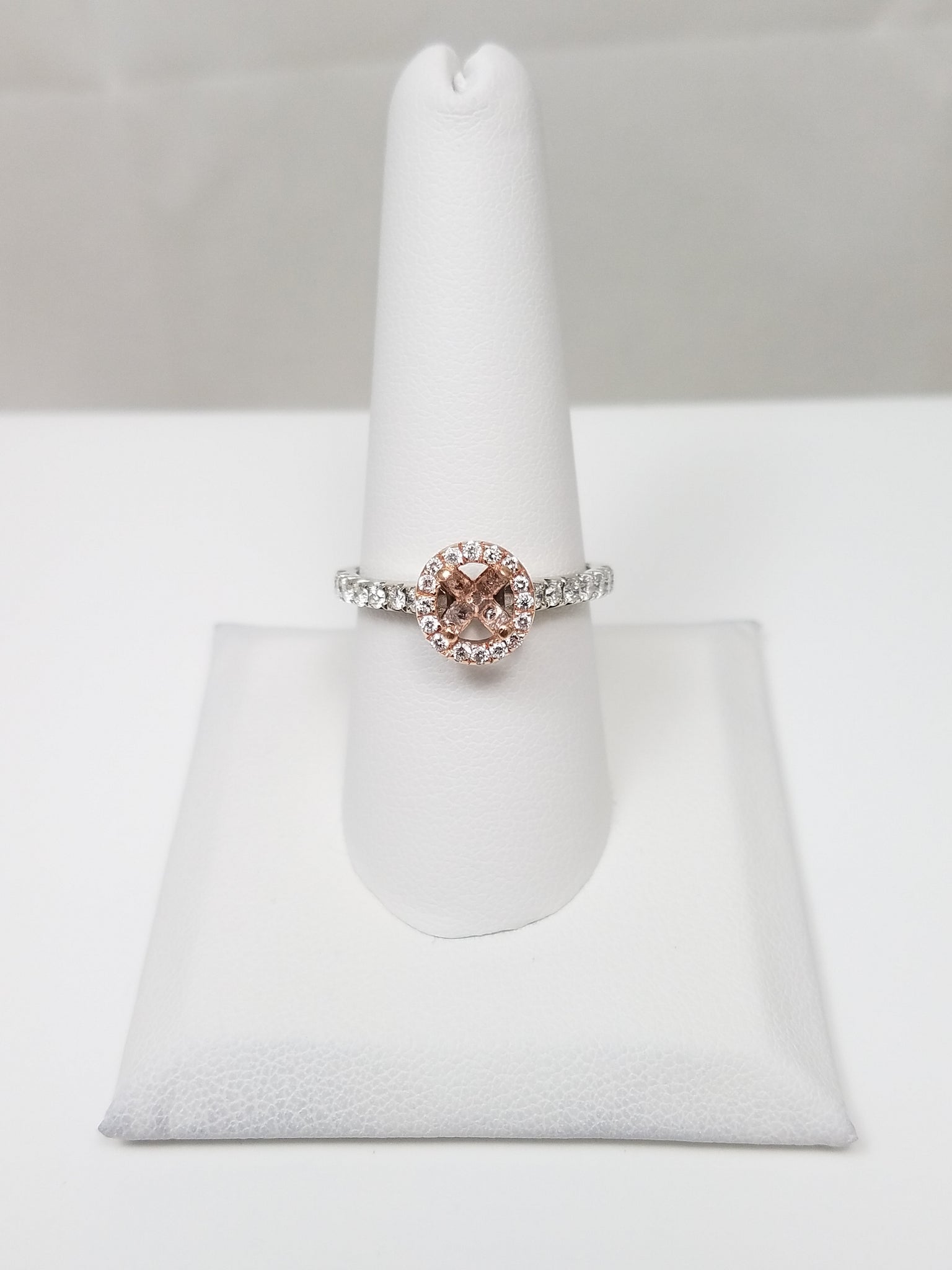 This fashionable natural diamond engagement ring mount was crafted from 14k white and rose gold (XRF tested). It features natural round diamonds weighing approximately .50ctw. The diamonds are SI in clarity and H in color. The mount will hold an approximate 5.2mm round gemstone. Ring size is 8.5. It weighs 3.3 grams.
