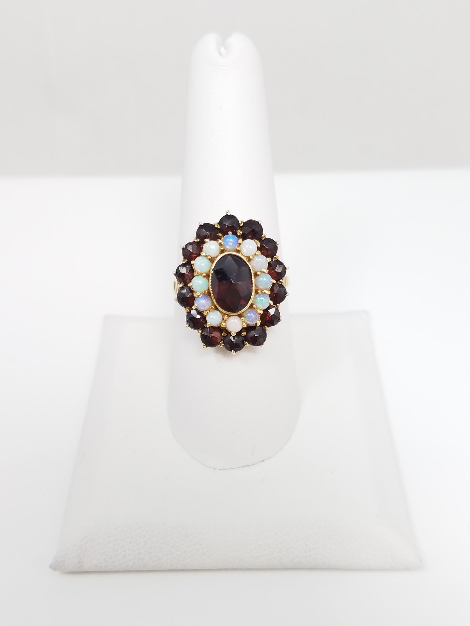 This enchanting vintage natural garnet and opal ring was crafted from 14k yellow gold (stamped "14k"). It features natural oval and natural round red garnets. They are accented with small round natural opal cabochons. The ring measures 22mm lengthwise on top of finger. Ring size is 8.5. It weighs 5.9 grams.