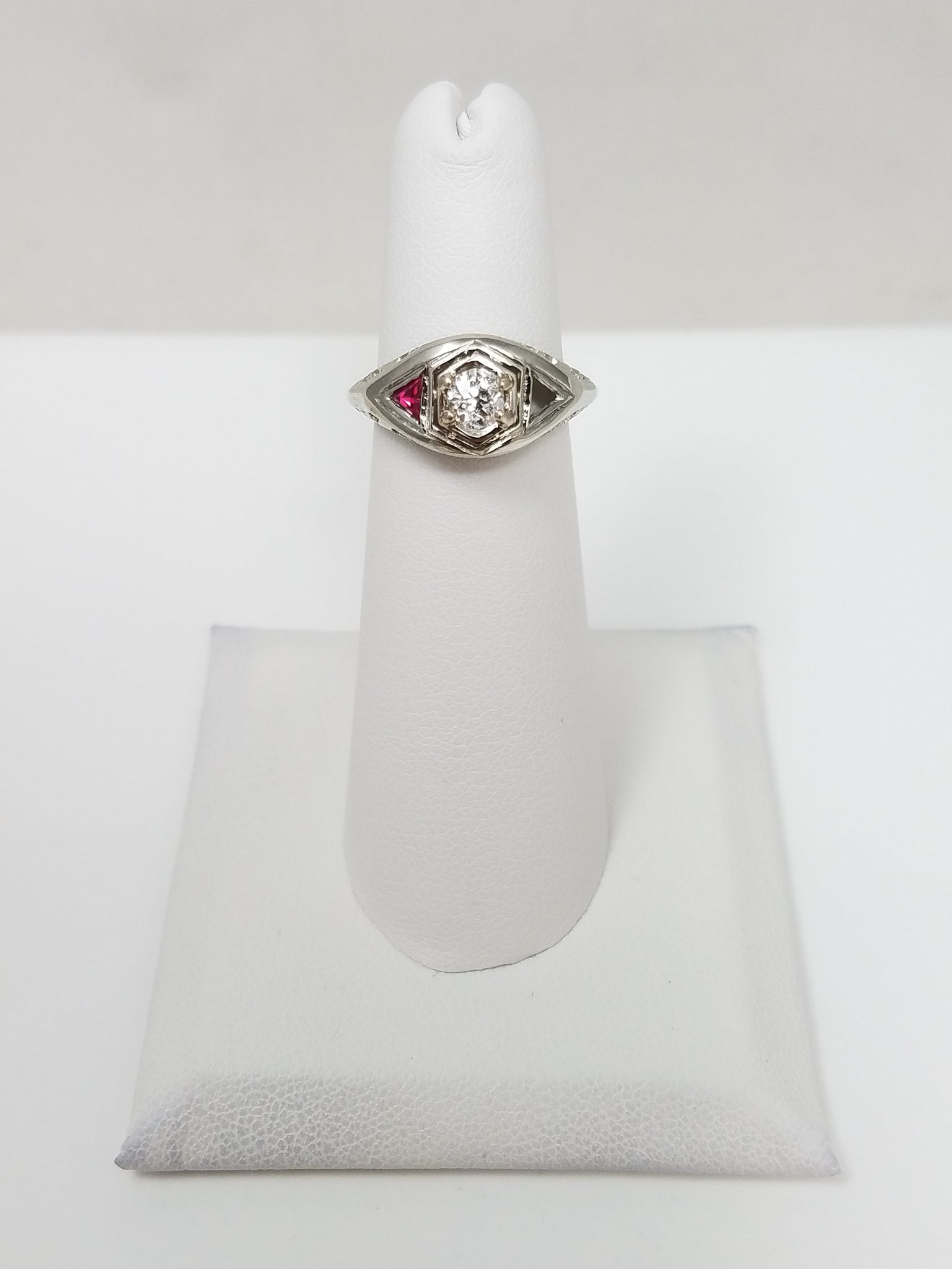 This lovely art deco natural diamond engagement ring was crafted from 18k white gold (stamped "18k"). It features a center natural round old lumpy cut diamond weighing ~1/4ct. The diamond is VS in clarity and H-I in color. It is accented with one synthetic ruby. One synthetic ruby is missing. It measures 8.8mm lengthwise on top of finger. Ring size is 4.5. It weighs 2.5 grams.