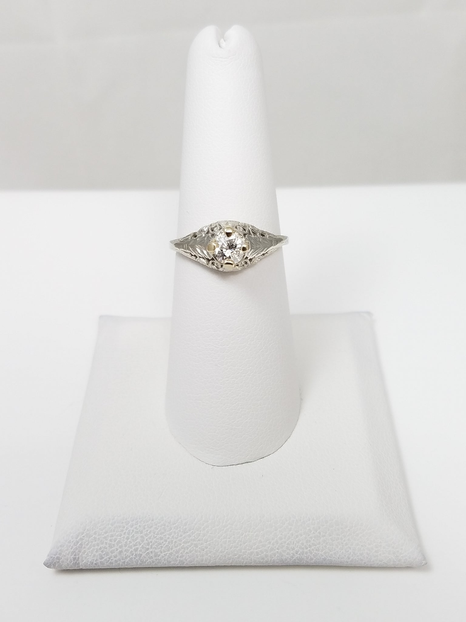 This majestic natural diamond art deco engagement ring was crafted from 18k white gold (XRF tested). It features one natural round diamond weighing approximately .33ct. The diamond is I2 in clarity and N-O in color. The diamond was not the original diamond that the ring was manufactured with. Ring size is 7. It weighs 2.4 grams.