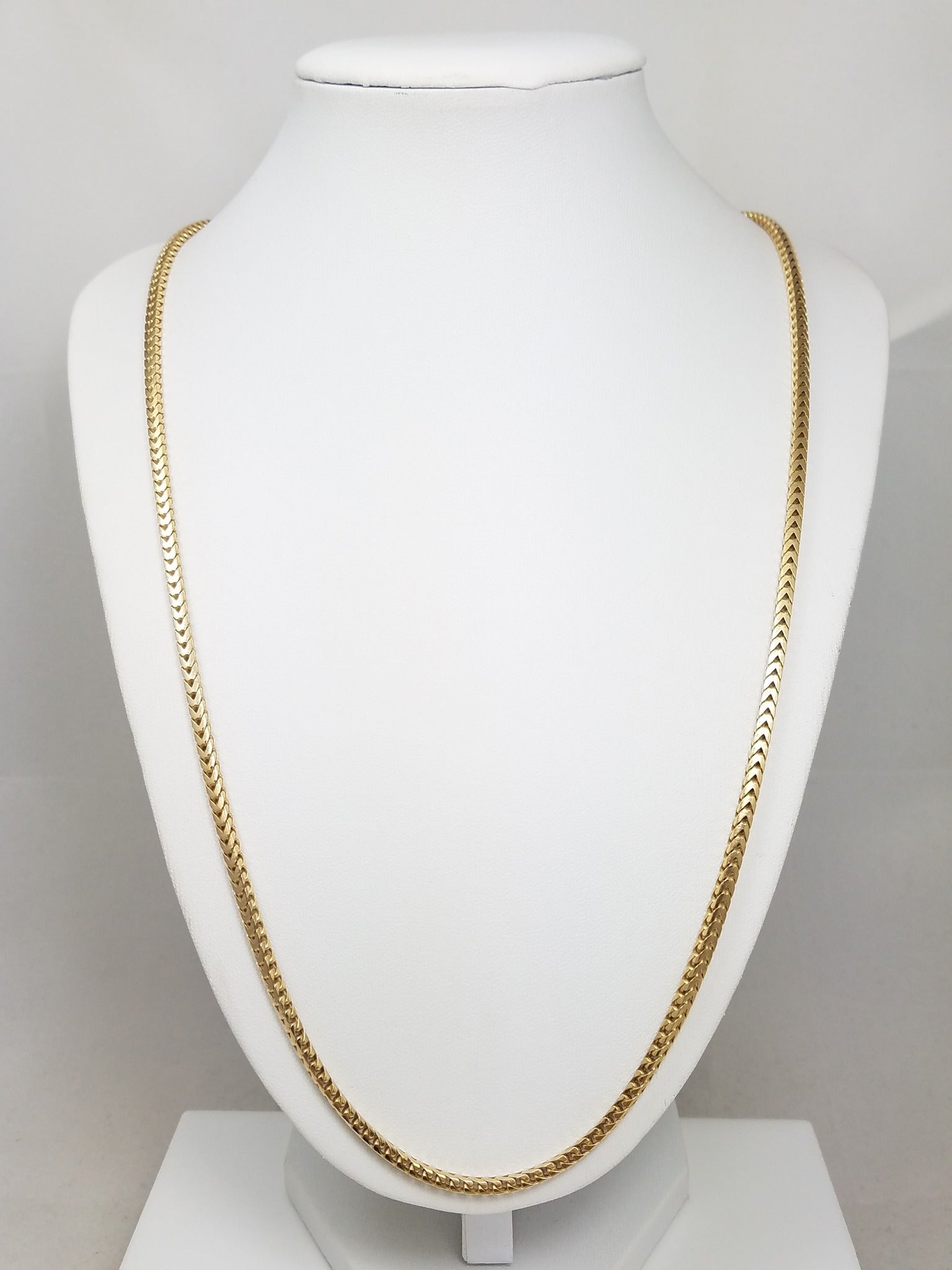 This sensational solid franco link chain necklace was crafted from 14k yellow gold (stamped "14k","585"). Add your favorite pendant to it. It measures 2.7mm wide and 28" in length and is secured with a lobster clasp for wear. It weighs 37.6 grams. Franco link chains are some of the nicest around!