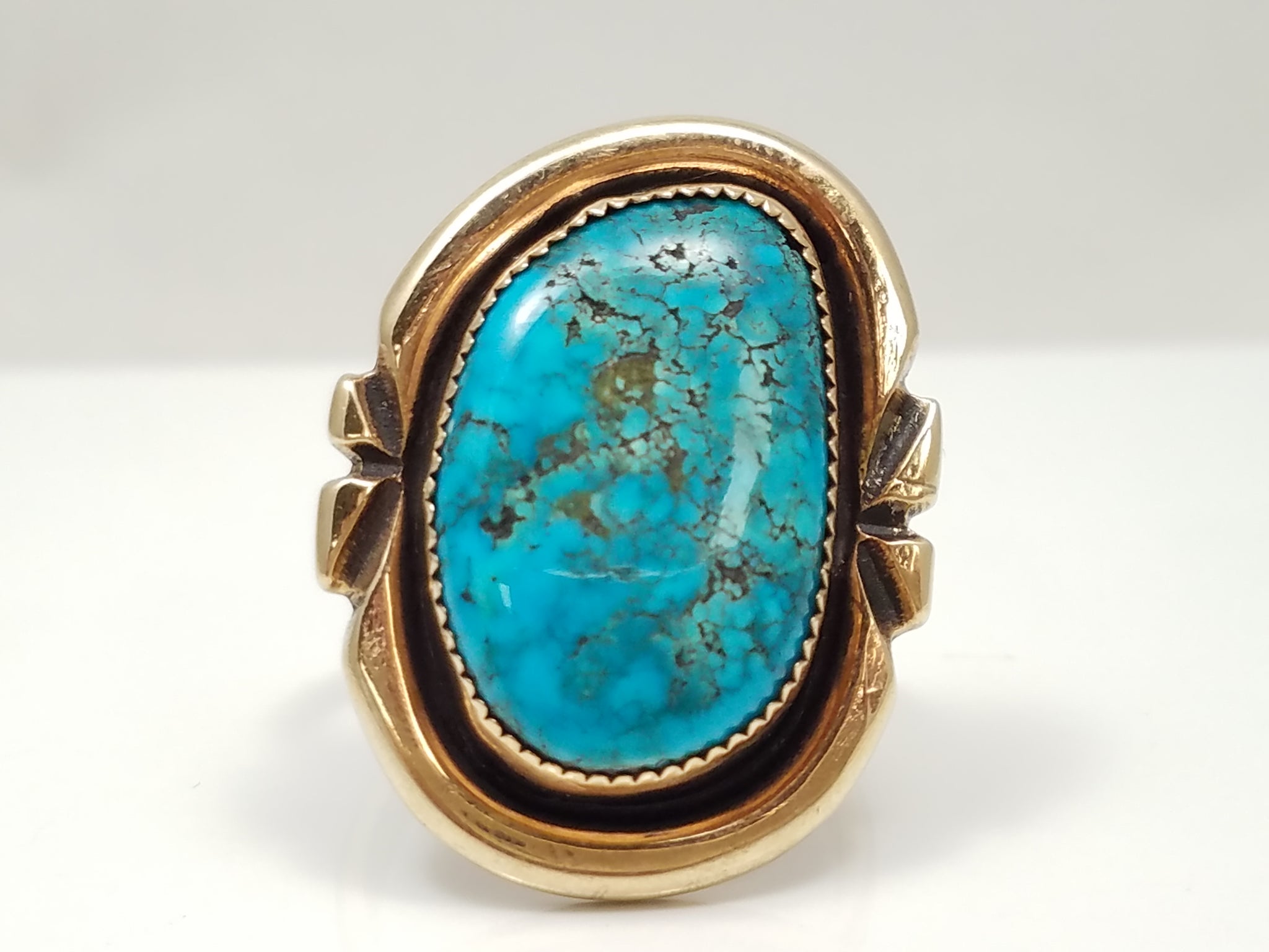 Extravagant Vintage 14k Yellow Gold Sterling Silver Natural Turquoise Ring