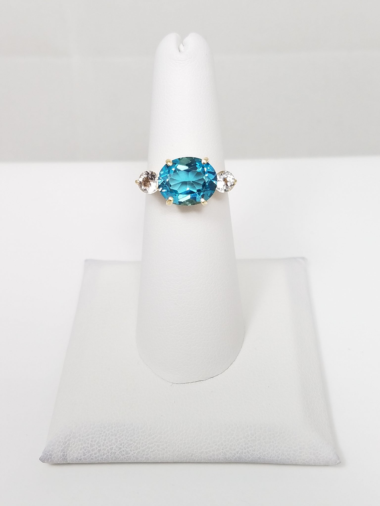 Fancy 14k Yellow Gold Blue + White Topaz 3-Stone Ring