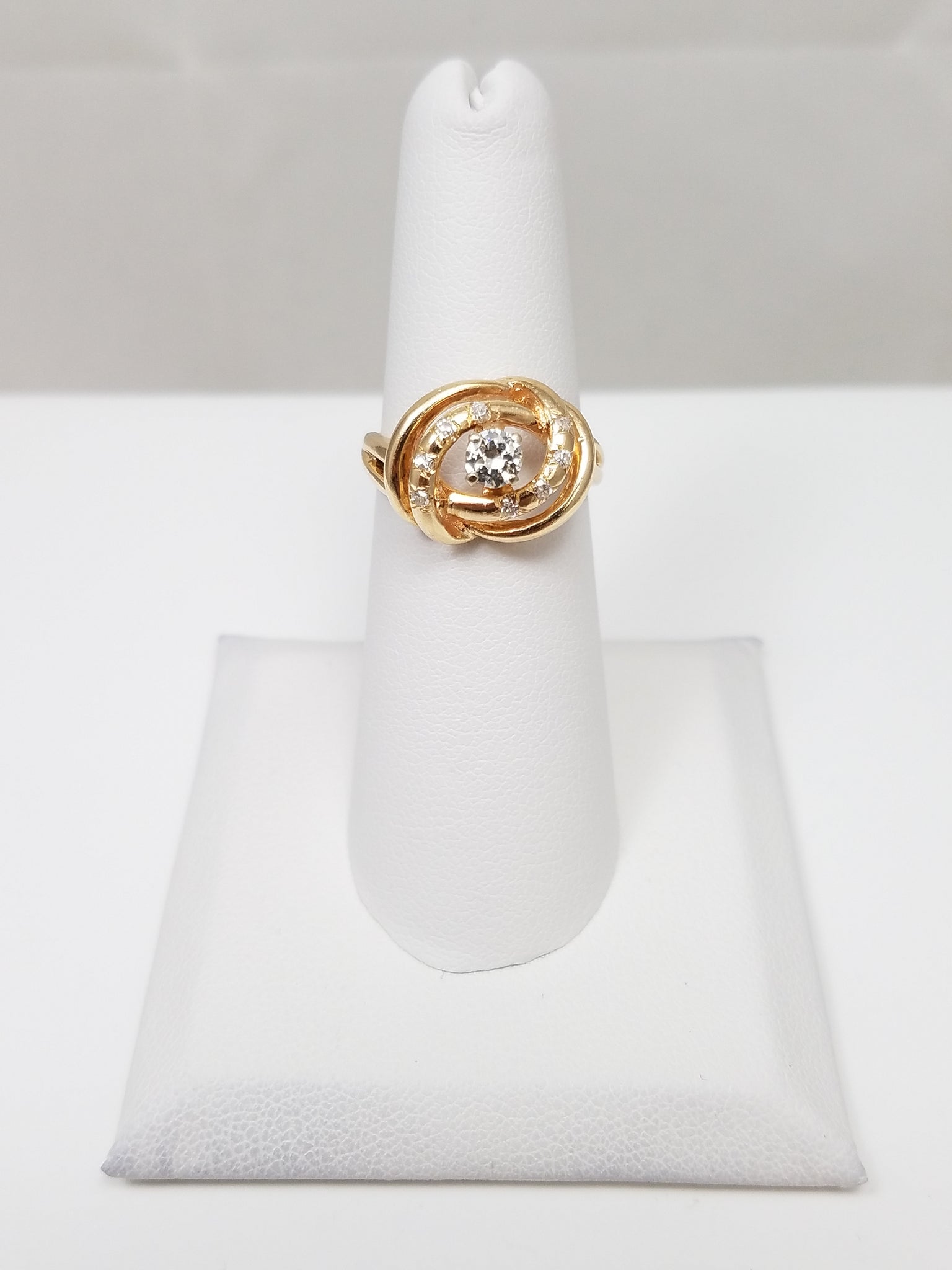 This lovely natural diamond engagement ring was crafted from 14k yellow gold (stamped "14k"). It features natural round diamonds weighing ~.25ctw. The diamonds are SI1 in clarity and J in color. The ring measures 12mm lengthwise on top of finger. Ring size is 5.5. It weighs 4.5 grams.