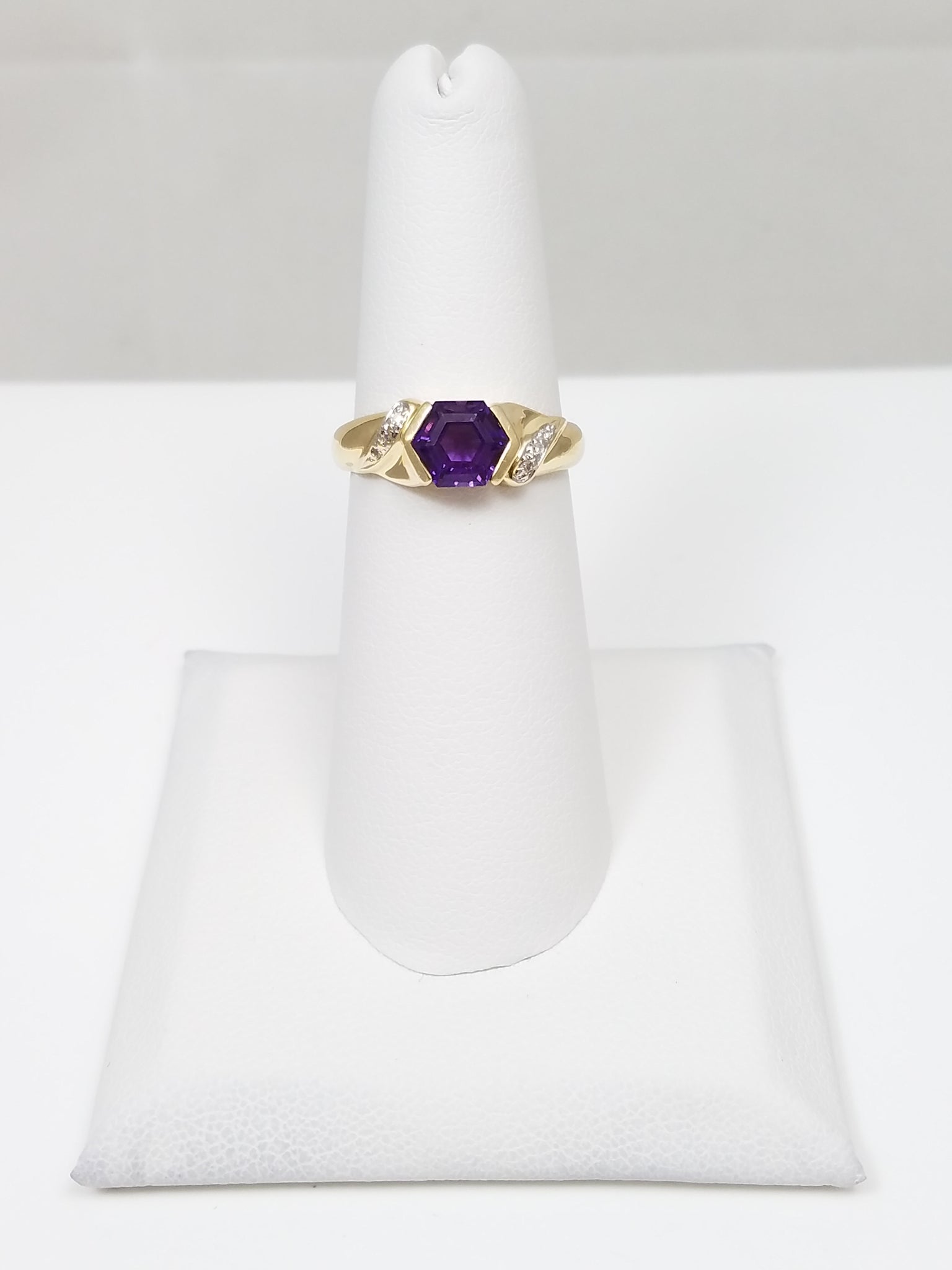 This beautiful natural amethyst and diamond ring was crafted from 14k yellow gold (stamped "14k"). It features a center natural six sided amethyst gemstone. It is accented with natural round diamonds weighing ~.02ctw. The diamonds are I1 in clarity and I-J in color. The ring measures 6.3mm lengthwise on top of finger. Ring size is 5.75. It weighs 2.4 grams.