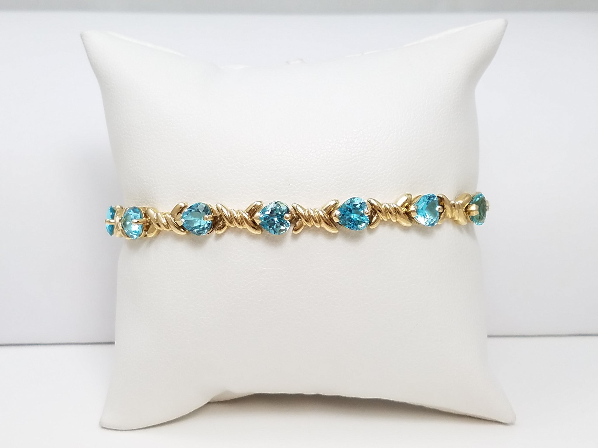 An elegant natural blue topaz bracelet crafted of 14k yellow gold (stamped "14k","585"). Features natural heart shaped blue topaz gemstones. The bracelet measures approximately 6mm wide and 7.5" in length. Weighs 12.8 grams.