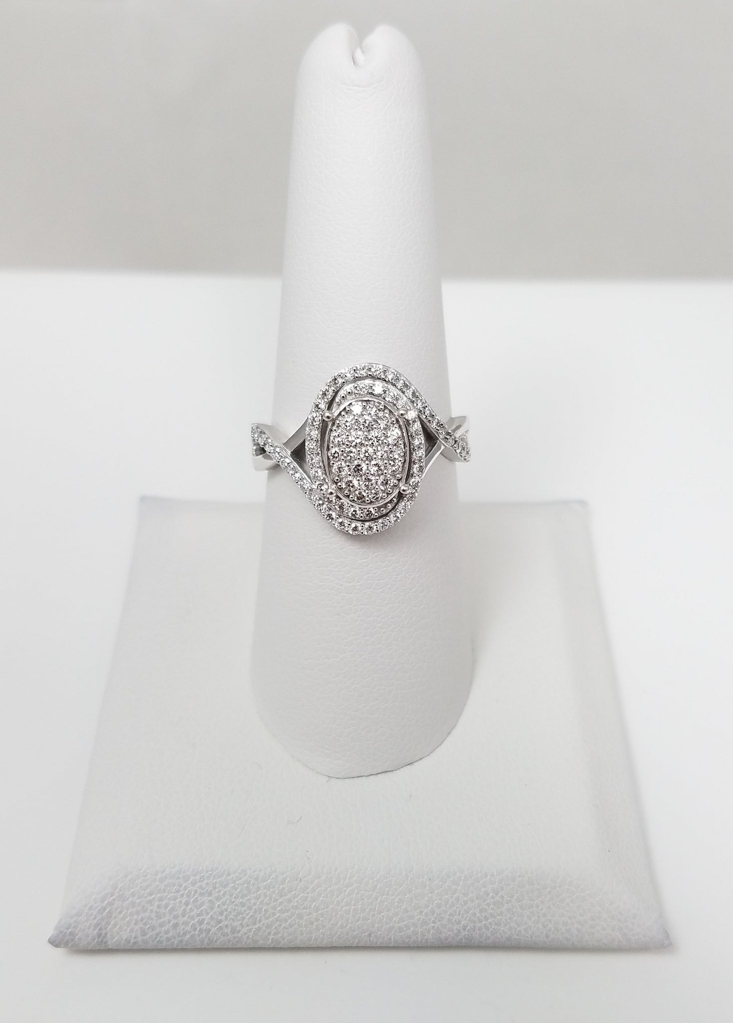 This dazzling natural diamond cluster ring was crafted from 14k white gold (stamped "14k"). It features very nice natural round diamonds weighing ~.50ctw. The diamonds are VS-SI in clarity and G-H in color. It measures 15mm lengthwise on top of finger. Ring size is 7.75. It weighs 4.4 grams.