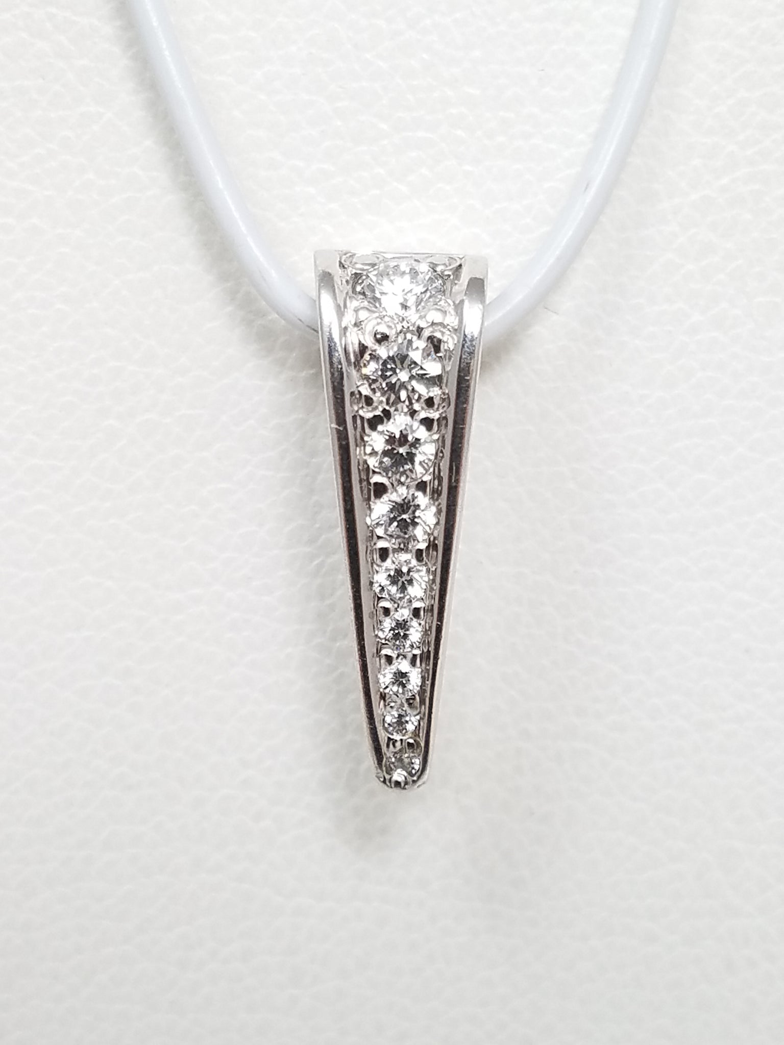 This beautiful natural diamond pendant bail was crafted from 14k white gold (tested). It features natural round diamonds weighing approximately .15ctw. The diamonds are VS-SI in clarity and G-H in color. It measures approximately 18mm in length. It weighs 3.3 grams. Add this to your favorite pendant!