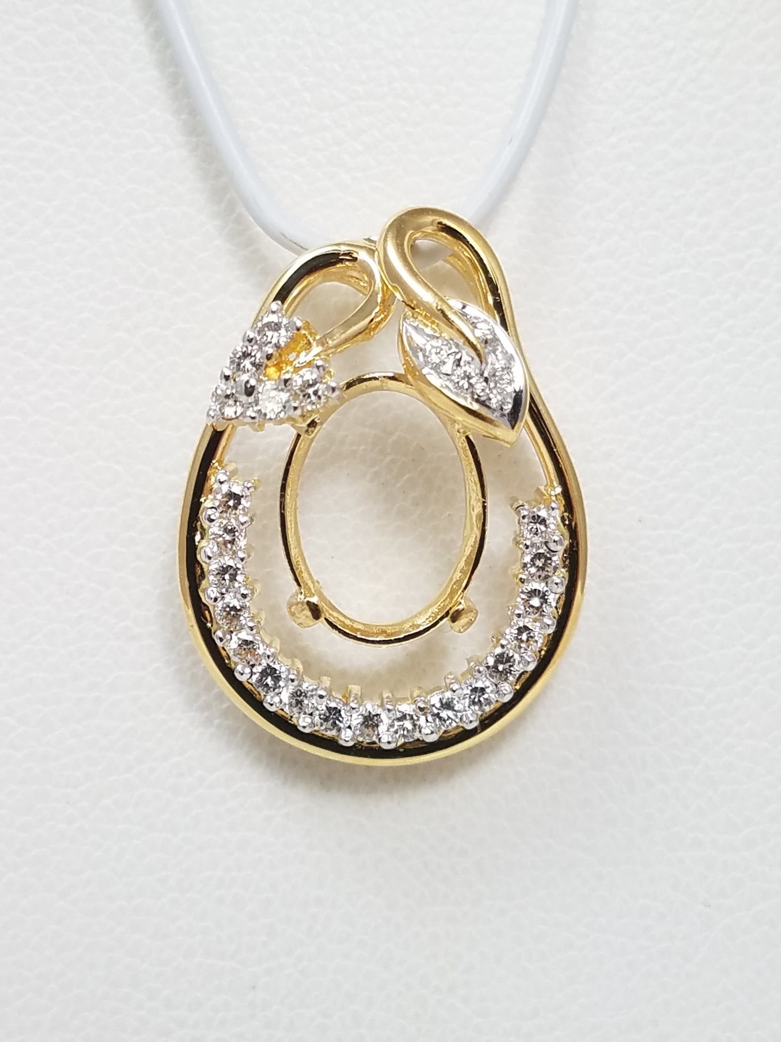 This stunning natural diamond pendant mount is crafted from 18k yellow gold (stamped "750"). The mount will hold an approximate 10 x 8mm oval gemstone. It features natural round diamonds weighing approximately .20ctw. The diamonds are SI in clarity and J-K in color. It is secured with 2 hoops for wear. It weighs 4.5 grams. The pendant measures 22 x 17mm.
