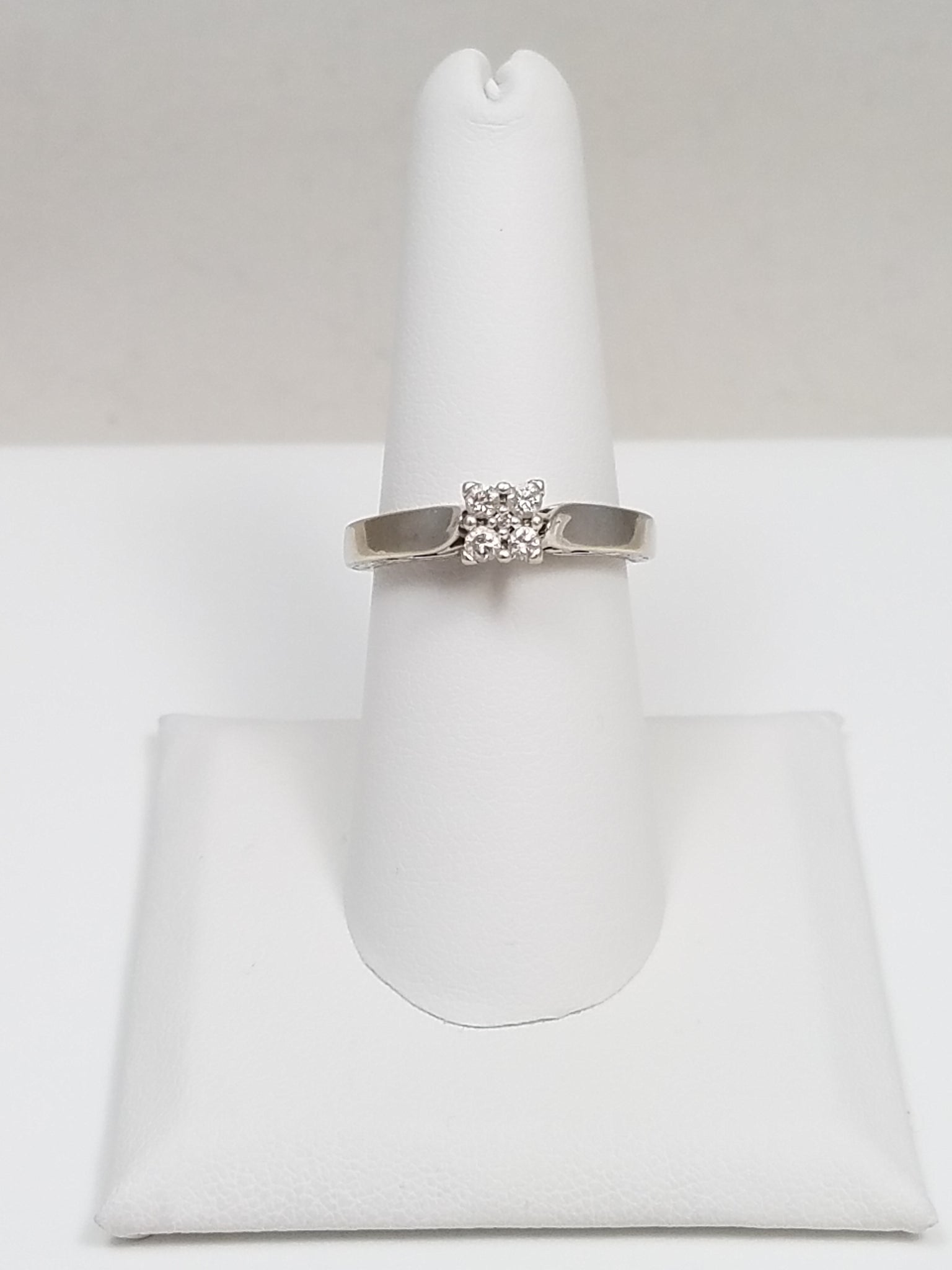 This dainty natural diamond engagement ring crafted of 10k white gold (stamped "10k"). This lovely ring features 4 natural round diamonds weighing approximately .25ctw. The diamonds are I1-I2 in clarity and I-J in color. Ring size is 7. Weighs 3.1 grams.