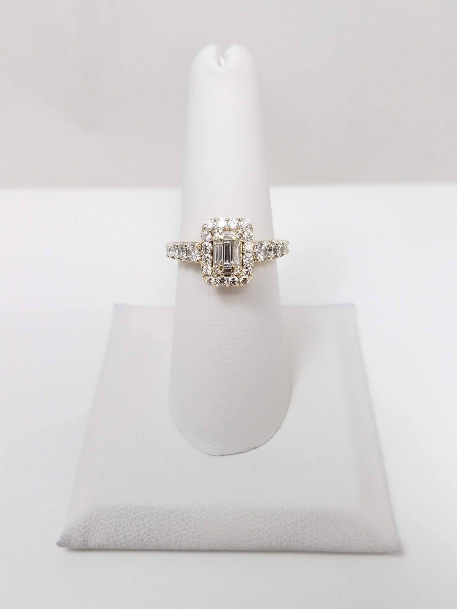 This sparkling natural diamond engagement ring was crafted from 14k yellow gold (stamped "14k"). It features a combination of natural round and natural baguette shaped diamonds weighing approximately .75ctw. The diamonds are VS1-I1 in clarity and H-I in color. The ring measures 10.8mm lengthwise on top of finger. Ring size is 6.5. It weighs 4.7 grams.