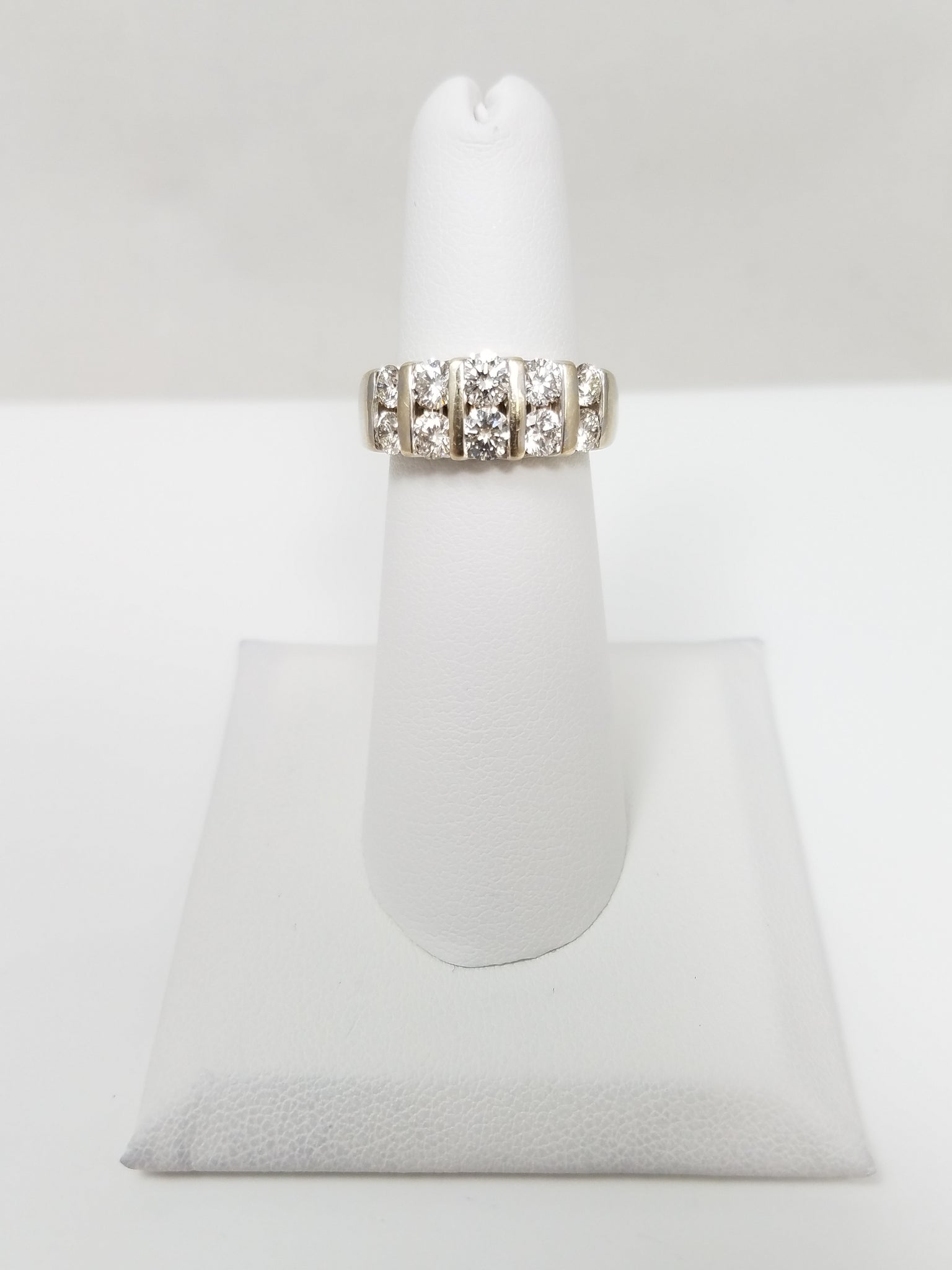 This shimmering natural diamond ring band was crafted from 18k white gold (stamped "18k"). They feature natural round diamonds weighing ~1ctw. The diamonds are SI1-I1 in clarity and I-J in color. It measures 7.6mm lengthwise on top of finger. Ring size is 5. The shank is out of round. It weighs 8.7 grams. The ring needs to be polished.