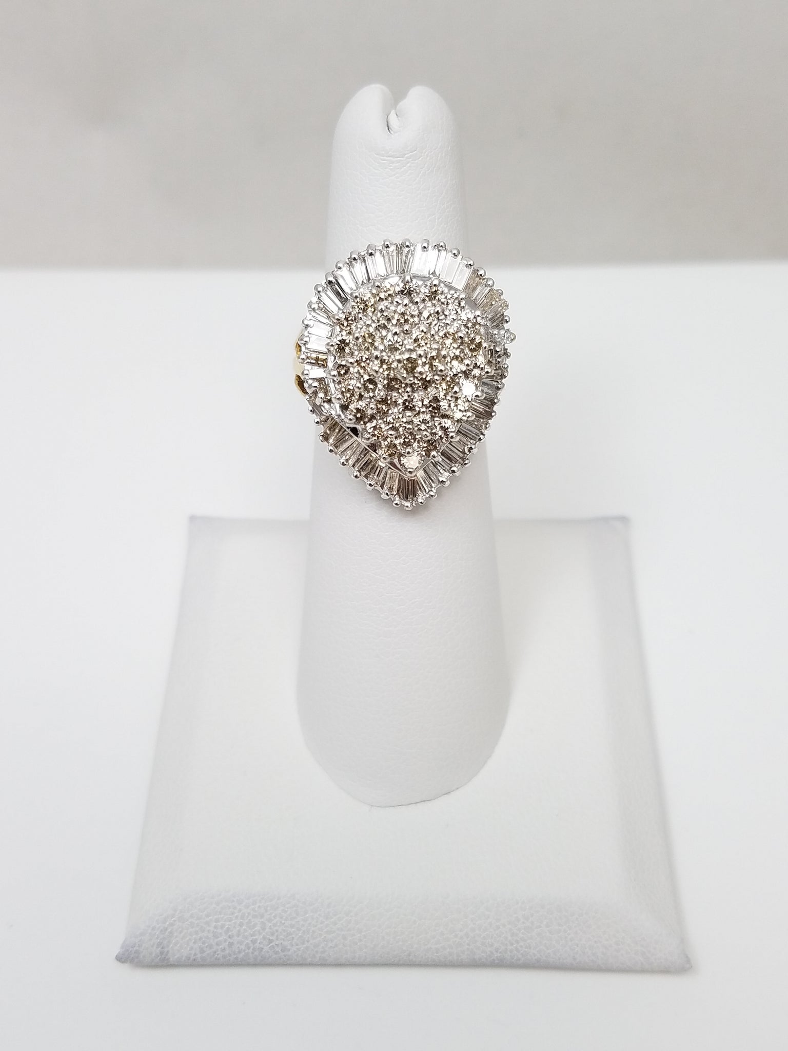 This 14k (stamped) yellow and white gold ballerina ring showcases a cluster of round brilliant natural diamonds in the center surrounded by baguette natural diamonds. Diamonds total ~1ctw and are SI-I1 in clarity and light brown in color. Ring measures 24mm wide on top and is a size 5. Weighs 8.9 grams.