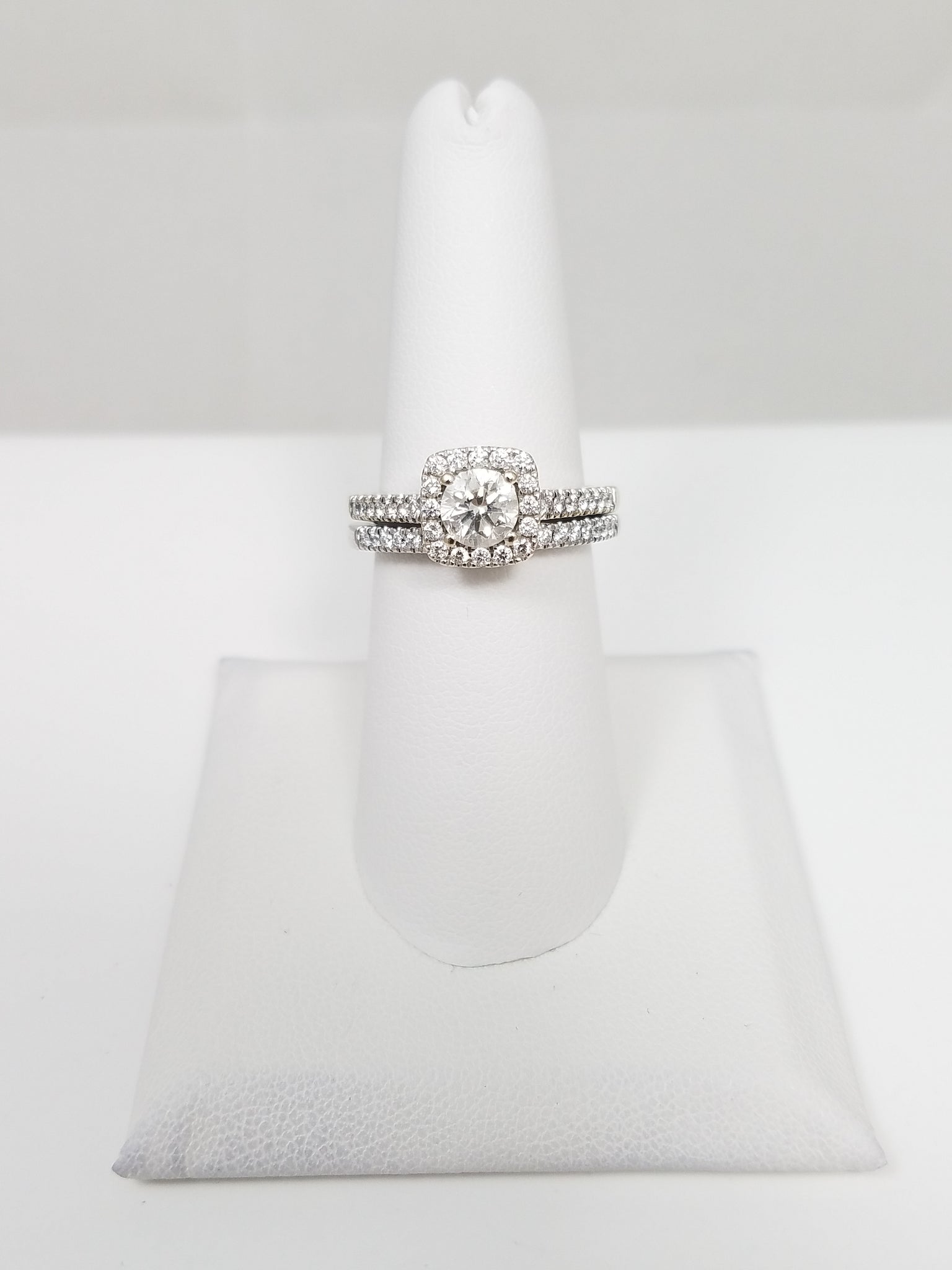 This stunning natural certified diamond engagement ring set was crafted from 18k white gold (stamped "18k"). It features a center natural round diamond that was certified by IGI. The diamond is I1+ in clarity and G in color and weighs .70ct. Diamond certificate #4105012375. It is accented with natural round diamonds weighing approximately .52ctw. The side diamonds are I1 in clarity and H-I in color. Ring size is 7. It weighs 9.1 grams total. No original IGI report.