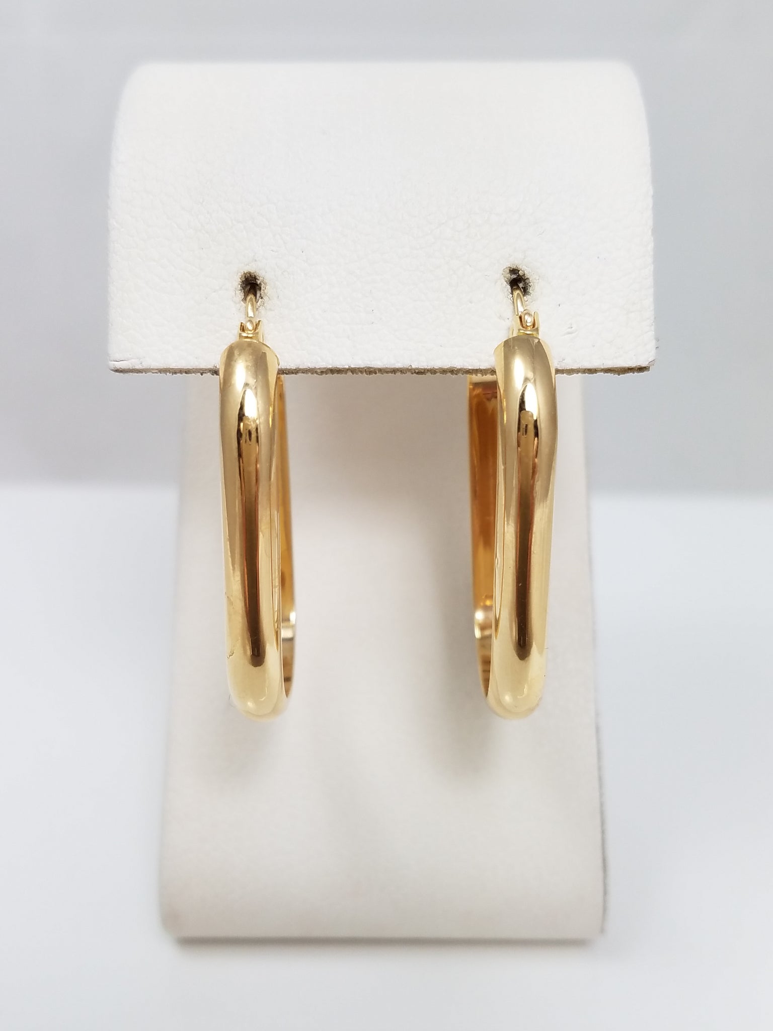 These 18k (stamped) yellow gold hollow elongated hoop earrings measure ~1.25" x 0.75", and 3.8mm thick. These hoops have tiny dings. Secure with hinged snap posts for wear. Weigh 2.4 grams total.