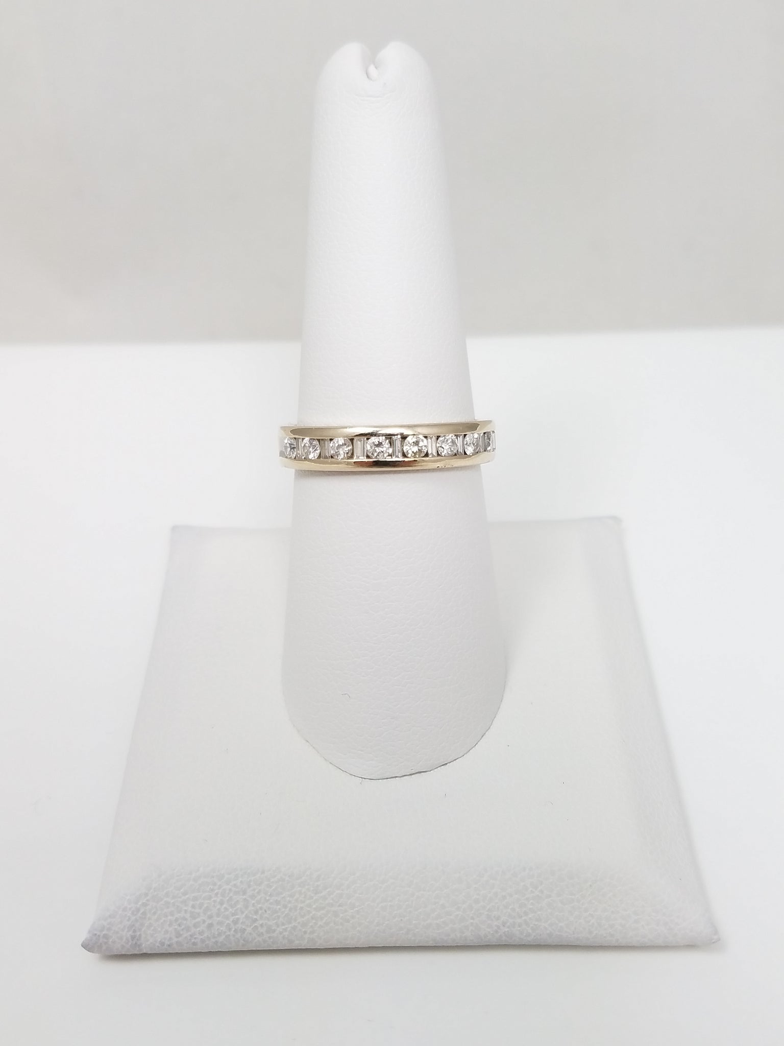 This classy natural diamond anniversary ring band was crafted of 14k white gold (stamped "14k"). It features a combination of natural round and natural baguette shaped diamonds weighing approximately .35ctw. The diamonds are SI1-I2 in clarity and H-J in color. It measures 4.1mm lengthwise on top of finger. Ring size is 7.5. It weighs 4.7 grams. The ring could use a polish and rhodium.
