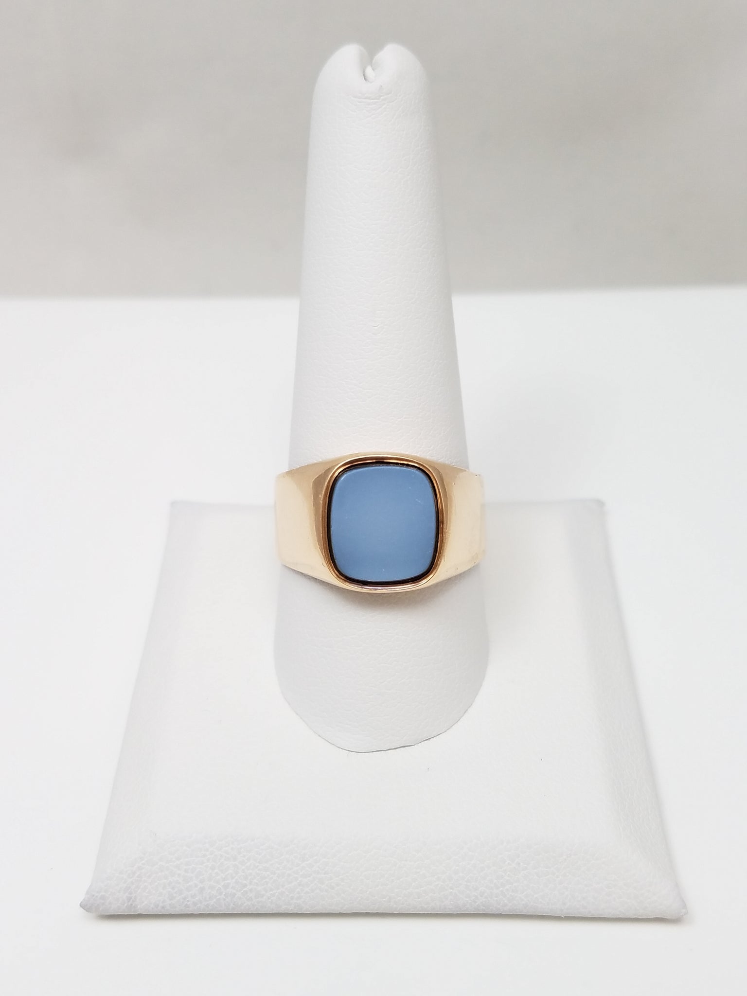 This men's ring is crafted in 12k (XRF) yellow gold and features a banded agate center piece. Ring measures 13mm wide on top and is a size 10.5. Weighs 6.0 grams.